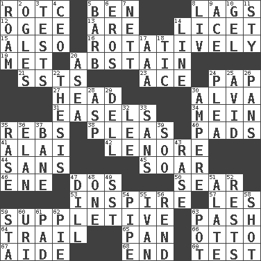 ACROSS 1. College mil. group 5. Benjamin's nick name 8. Falls behind 12. Double curve, resembling the letter S 13. "We ___ not amused" (Victoria) 14. It is permitted: Lat. 15. In addition 16. Rotating or pertaining to rotation 19. Was introduced to 20. Choose not to consume 21. Fast planes 23. Adept person 24. Infant food 27. Froth on beer 30. Inventor's middle name 31. Artist's stands 34. Chow _ 35. Confederate soldiers (slang) 38. Entreaties 40. Writing tablets 41. Mountain range southwest of Kyrgyzstan 42. Poe poem 44. Without 45. Fly high 46. Compass dir. 47. Two (Sp.) 50. Burn superficially 53. Stimulate to action 57. French article 59. Supplying deficiencies 63. Romantic infatuation 64. Hang back 65. Baking dish 66. Von Bismarck 67. Assistant 68. Conclusion 69. Trial DOWN 1. Wander aimlessly 2. Stares at amorously 3. Trials 4. Corporate head (abbr.) 5. Sharp remark 6. Greek god of love 7. Remaining after all deductions 8. 54 in ancient Rome 9. Adept person 10. Set 11. Filthy place 14. Actor's bit 17. American Automobile Association (abbr.) 18. Nervous spasm 20. At sea 22. College paper 24. Entreaty 25. Enthusiastic 26. Zero-star reviews 28. Viper 29. Small valley 30. Electrical Unit 32. Area sheltered from the wind 33. Without 35. To erase 36. Flair 37. Object of repulsion 39. "Barney Miller" actor Jack 43. Raze (variant) 47. Deli pickle 48. Single 49. Fast jet (abbr.) 51. Having winglike extensions 52. Musical pauses 54. Corncob 55. _ the terrible 56. Tear apart 58. Attempt 59. R.R. building 60. RI univ. 61. Writing tablet 62. Sliced dessert 63. Plant holder