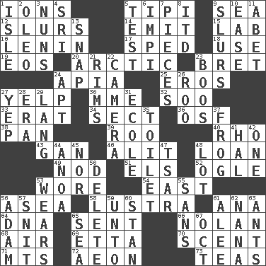 ACROSS 1. Charged particles 5. Native american tent (variation) 9. Ocean 12. Disparaging remarks 14. Give off 15. Experiment locale 16. Soviet premier 1918-24 17. Hurried 18. Purpose 19. Greek goddess of the dawn 20. Northern region 23. Cy Young winner Saberhagen 24. Capital of Western Samoa 25. Greek god of love 27. Sharp bark 30. Madame (abbr.) 32. "Barney Miller" actor Jack 33. Part of Q.E.F. 34. Religious group 36. Order of Saint Francis (abbr.) 38. Baking dish 39. Friend of Pooh 40. 17th letter of the Greek alphabet 43. Separate the seeds from cotton 46. Set down 48. Grant temporary use of 49. Allow head to fall sleepily 51. Raised railways 52. Stare 53. Had on 54. Compass direction 56. Toward the sea 58. A period of five years 61. Santa ___, CA 64. Heredity factor (abbr.) 65. Transmitted 66. Pitcher Ryan 68. Wind 69. Singer James 70. Odor 71. Mountains (abbr.) 72. Period of immesurable duration 73. Afternoon social gatherings DOWN 1. Small island 2. Butter sub 3. Religious women 4. _ Lanka 5. Trial 6. Body of Kaffir warriors 7. Components 8. It would 9. Disparaging remarks 10. Comfort 11. Collude with 13. Fastener 21. Basketball hoops 22. Device for capturing images 23. Scornful sounds 24. Fitting 26. Friend of Pooh 27. Slangy assent 28. Epoch 29. Austrian-born American filmmaker Fritz 31. Learning spot: Fr. 35. Bathroom 37. Toadlike animal 41. Actor Linden 42. Single 44. Small Philippine buffalo 45. Or not 47. Russian ruler of old 48. Car dealer's back yard 50. Erase 53. Erodes 55. Without 56. First man 57. In a ____ (agitated or irritated) 59. To (old English) 60. Comedian Laurel of Laurel & Hardy 61. Toward shelter 62. Nanny 63. Pismires 65. Ocean 67. Sep. follower
