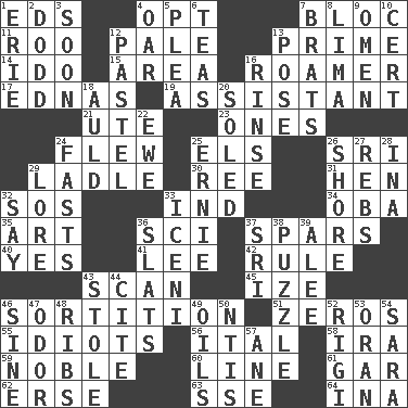 ACROSS 1. Begley and Asner 4. Elect 7. Coalition 11. Friend of Pooh 12. Light colored 13. First class 14. Wedding promise 15. Length times width 16. Nomad 17. Ferber et al. 19. Helper 21. Shoshoni 23. Washington bills 24. Soared 25. Raised railways 26. Indian title of respect (Mr.) 29. Dipping utensil 30. To riddle 31. Layer 32. Distress signal 33. Working for oneself (abbr.) 34. Chief or king in Benin or Nigeria 35. Tate display 36. _-fi 37. Practice fights 40. It is so 41. Area sheltered from the wind 42. Governing power 43. Glance over 45. Ending with capital 46. Casting lots 51. Nothings 55. Foolish or stupid persons 56. Slanted text style (abbr.) 58. Lyricist Gershwin 59. Impressive in appearance 60. Actor's bit 61. Slender fish 62. Celtic language 63. Compass dir. 64. _ tizzy (2 wds.) DOWN 1. 4th largest of the Great Lakes 2. Texas town _ City 3. Within a short period 4. Rowing implement 5. Entreaty 6. Afternoon social gatherings 7. Naughty children 8. Pale green bean 9. Sign of something about to happen 10. Certainty 12. Soft color 13. Introduce or present, as a question 16. Remove soap 18. Old (Scot.) 20. Having a sole or soles 22. She-sheep 24. Goes without food and/or water 25. Bert's buddy 26. Dinah or Pauly 27. Confederate soldiers (slang) 28. _ tizzy (2 wds.) 29. Old wives' tales, e.g. 32. Declare 33. Ancient Celtic tribe of eastern Britain 36. Narrow boards 37. Indian title of respect (Mr.) 38. What's this? 39. Toward shelter 43. Took without asking 44. Quote 46. Trig term 47. Scent 48. Teases 49. Lubricates 50. Nuclear Threat Initiatives 52. Swiss mountan, "Queen of the Mountains" 53. NW Algerian seaport 54. "Two Mules for Sister ____" 57. A saturated hydrocarbon
