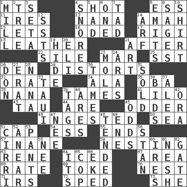 ACROSS 1. Mountains (abbr.) 4. Opportunity 8. Curvy letter 11. Angers 13. Nanny 14. Wet nurse 15. Allows 16. Wrote a lyric poem 17. Swiss mountan, "Queen of the Mountains" 18. Cordwainer's material 21. Following 22. Drop; flow; fall 23. Impair 25. Fast jet (abbr.) 26. Lair 29. What propaganda does 32. Declaim 34. Wing 35. Chief or king in Benin or Nigeria 38. Grandmother 39. Softens 41. _ and Stitch 43. The 19th letter of the Greek alphabet 44. "We ___ not amused" (Victoria) 45. More peculiar 46. Swallowed 50. Ocean 51. Head covering 54. Curvy letter 55. Extremities 57. Empty; void 59. Nestling 63. French philosopher Descartes 64. On the rocks 67. Type of rug 68. Assign a rank or rating to 69. Puff or smoke 70. Egg locale 71. Big collection agency 72. Moved rapidly 73. A female animal or person DOWN 1. Place where flour is made 2. Woody plant 3. Stalk of a moss capsule 4. Sounds asleep 5. Possessed 6. Single 7. Small amount or degree 8. Sends forth 9. Gurus 10. Chest covering 12. Fast planes 14. Sandy's bark 19. Flintstone garb 20. Biblical high priest 21. Tate display 23. Undercover agent 24. Caspian sea tributary 26. Spanish title 27. Part of Q.E.F. 28. Nanny 30. Softens 31. Disposed of to a purchaser 33. "Change" in Tahitian 36. Auction offers 37. Toward shelter 39. Labels 40. Ancient Greek god of war 42. Mouth or opening 45. Likelihood 47. Born 48. Looked after 49. Compass dir. 51. High-altitude cloud 52. Approach 53. Leg coverings 56. Comedian Laurel of Laurel & Hardy 58. Born 60. Angers 61. Tender 62. Yard entry 64. It is 65. Police officer (slang) 66. Make supply last