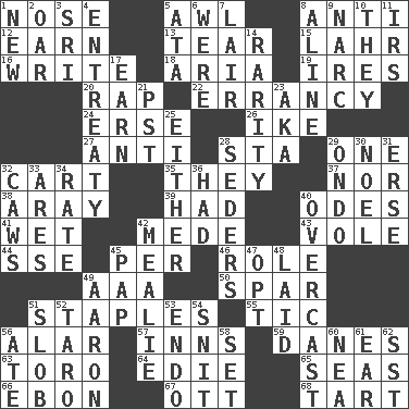 ACROSS 1. Sense of smell 5. Leather borer 8. Against 12. Merit 13. Pull apart 15. Cowardly lion portrayer 16. Compose 18. Roberta Peters solo 19. Angers 20. Hit sharply and swiftly 22. The state or an instance of erring 24. Celtic language 26. D.D.E's nickname 27. Opposed to 28. R.R. building 29. Single 32. Haul 35. Those people 37. Or not 38. Like ___ of sunshine 39. Possessed 40. Lyric poems 41. Soggy 42. Ancient Persian 43. Grand slam 44. Compass dir. 45. For each 46. Hero or heavy, e.g. 49. American Automobile Association (abbr.) 50. Practice fight 51. Paper fasteners 55. Nervous spasm 56. Having or resembling wings 57. Restaurants 59. Natives or inhabitants of Denmark 63. "Corrida" creature 64. Singer Brickell 65. Oceans 66. Inky black, to poets 67. Baseball player Mel 68. Small pie DOWN 1. ___ Haven, CT 2. Boat paddle 3. _ Lanka 4. Plea 5. "One Day ___ Time" 6. Past tense of be (plural) 7. Den 8. Place in a line 9. Drug cop 10. Those things 11. Big collection agency 14. Noteworthy scarcity 17. Merit 21. Pacific Standard Time (abbr.) 23. Alias (abbr.) 25. One or the other of two 28. Spring feasts 29. Southwest Nigerian state 30. Christmas carol 31. Celtic language 32. Crow sounds 33. Ancient Greek god of war 34. Pace 36. Possessed 40. Cloudy 42. Ear of corn 45. Infant food 47. Choose 48. Put down 49. Composer Copland 51. Messy guy 52. Edible starchy tuberous root 53. Inside; within (prefix) 54. In a ____ (agitated or irritated) 56. Had dinner 58. Put into a specified state 60. Teachers' org. 61. Ewer handle 62. Fast jet (abbr.)