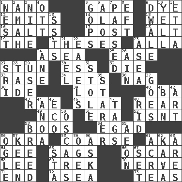 ACROSS 1. Billionth: prefix 5. Open wide 9. Color 12. Sends forth 14. Norwegian king 15. Dripping 16. Table seasonings 17. Mail 18. Keyboard modifier key 19. Definite Article 20. College papers 23. Silent film actress Nazimova 24. At sea 25. Relaxation 27. Astound 30. Double-curved letter 32. Expire 33. Raze (variant) 34. Allows 36. Tired old horse 38. Binary compound 39. Car dealer's back yard 40. Chief or king in Benin or Nigeria 43. Actress Charlotte 46. Narrow board 48. Stern 49. Non-commissioned officer (abbr.) 51. Period 52. Is not 53. Scornful sounds 54. Mild oath 56. Gumbo ingredient 58. Rough 61. Alias (abbr.) 64. Unit of force equal to gravity 65. Settles 66. Motion picture award 68. Area sheltered from the wind 69. Long journey 70. Impudent aggressiveness 71. Conclude 72. Toward the sea 73. Beverages made from leaves DOWN 1. Egg locale 2. Housemaid 3. "Death on the ____" 4. Baseball player Mel 5. Republicans 6. Medicinal plant 7. Went by 8. Bank Draft (abbr.) 9. A sleeping potion; an opiate (poet.) 10. Shout 11. Singer James 13. Fast planes 21. The bottom of a shoe or boot 22. Artist's stands 23. At sea 24. A saturated hydrocarbon 26. The 18th letter of the Arabic alphabet 27. Indian title of respect (Mr.) 28. Small amount or degree 29. One who uses or employs something 31. Fur scarf 35. A viewer who gazes fixedly 37. Moves 41. Prohibit 42. Tate display 44. Small Philippine buffalo 45. Environmental prefix 47. Labels 48. To free from 50. Motion picture awards 53. A special lineage 55. Period of immesurable duration 56. Stare at amorously 57. Peachy ____! 59. Double curve, resembling the letter S 60. "____ silly question..." 61. 1/640 square mile 62. Polynesian shrub of the pepper family 63. Ancient Greek god of war 65. R.R. building 67. Put into a specified state