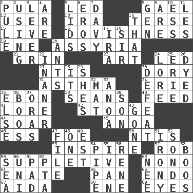 ACROSS 1. Monetary unit of Botswana 5. Directed 8. Highlander 12. One who uses or employs something 13. Lyricist Gershwin 14. Laconic 15. Moving, as bait 16. Innocence, gentleness, or tenderness 19. Compass dir. 20. Nineveh was its capital 21. Broad smile 23. Nonscientific branch of learning 24. Directed 27. Nuclear Threat Initiatives 30. Dinghy 31. Respiratory problem 34. 4th largest of the Great Lakes 35. Inky black, to poets 38. Seines 40. Nourish 41. Old wives' tales, e.g. 42. Moe Howard, for one 44. Fly high 45. Small Philippine buffalo 46. Curvy letter 47. Enemy 50. Nuclear Threat Initiatives 53. Motivate 57. Director Reiner 59. Supplying deficiencies 63. Words to Nanette 64. Maternal 65. Baking dish 66. Inside; within (prefix) 67. Opera by Verdi 68. Compass dir. 69. Sight organs DOWN 1. Whimper 2. Putting into practice 3. Crowbar 4. "We ___ not amused" (Victoria) 5. Flaplike coverings 6. Greek god of love 7. American folk hero Crockett 8. Commissioned military rank (abbr.) 9. "We ___ not amused" (Victoria) 10. Double-curved letter 11. French article 14. Not this but _ 17. Retirement account (abbr.) 18. Title for a knight 20. Pismires 22. More empty; more void 24. Old wives' tales, e.g. 25. 4th largest of the Great Lakes 26. Colored 28. It is 29. "______ My Girl" (Turtles hit) 30. Outscore 32. Floor protector 33. Small Philippine buffalo 35. Otherwise 36. Scornful sounds 37. Mouths or openings 39. Male offspring 43. Went 47. Do some clerical work 48. Single 49. Eastern Standard Time (abbr.) 51. Literary sarcasm 52. Message 54. Corncob 55. _ the terrible 56. French philosopher Descartes 58. Expressions of contempt or scorn 59. Ocean 60. Corn or form start 61. Writing tablet 62. Parent Teacher Association (abbr.) 63. Born