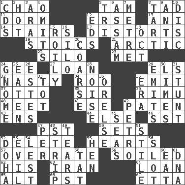 ACROSS 1. US Secretary of Labor Elaine L. _ 5. Scottish cap 8. Bit 11. Dormintory (informal) 12. Celtic language 13. Black tropical American cuckoo 14. Flight of steps 17. What propaganda does 19. Unemotional ones 21. Northern region 22. Grain storage tower 23. Was introduced to 24. Unit of force equal to gravity 27. Grant temporary use of 29. Raised railways 32. Difficult 34. Friend of Pooh 36. Send forth 37. Von Bismarck 38. Title for a knight 39. Tall New Zealand timber tree 40. Confront 41. Compass dir. 42. Eucharist need 43. Followers of ems 44. Otherwise 46. Fast jet (abbr.) 47. Pacific Standard Time (abbr.) 50. Puts into a specified state 52. Keyboard key 55. Centers 57. Make much ado about nothing 59. Dirtied 62. Part of HMS, perhaps 63. SW Asia republic 64. Grant temporary use of 65. The first octave above the treble staff 66. Pacific Standard Time (abbr.) 67. Singer James DOWN 1. Music discs 2. Being at a high temperature 3. Ancient river in northeast Turkey 4. Leaves out 5. Three (prefix) 6. Indian state 7. Distance measurement (Brit.) 8. Small pie 9. Against 10. Compact _ 12. Begley and Asner 15. Agitated, as a liquid 16. Grain storage tower 18. Sep. follower 20. Unrefined 24. Dwarf 25. Ingested 26. _____ Park, CO 28. Annoying sound 29. Gives off 30. Citrus fruits 31. Difficult or unusual or dangerous feat 33. Small child 35. Threatening words 36. Period 42. Stone: prefix 45. Oceans 47. For each 48. Empty completely 49. Lacerates 51. Vertical member of a panel or frame 52. Capital of the state of Qatar 53. Morally bad or wrong 54. For fear that 55. Layer 56. Slit 58. Make lace 60. Ingest 61. Heredity factor (abbr.)