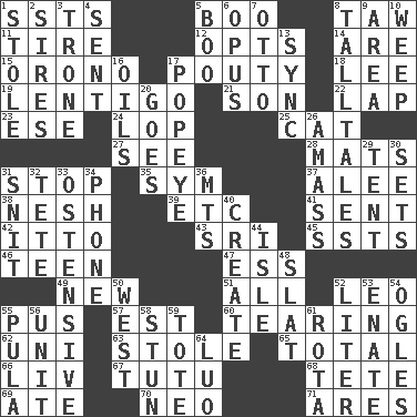 ACROSS 1. Fast planes 5. Oct. 31 cry 8. The 23rd letter of the Hebrew alphabet 11. Become fatigued 12. Chooses 14. "We ___ not amused" (Victoria) 15. U. of Maine site 17. Marked by pouting 18. Area sheltered from the wind 19. Small, flat, pigmented spot on the skin 21. Boy, to dad 22. Pet locale 23. Compass dir. 24. Chop off 25. Feline 27. Observe 28. Floor protectors 31. Halt 35. Symbol (abbr.) 37. Toward shelter 38. Tender 39. And so on (abbr.) 41. Posted 42. "Tell ____ the Marines!" 43. Indian title of respect (Mr.) 45. Fast planes 46. Adolescent 47. Double-curved letter 49. ___ Haven, CT 51. Everything 52. Lion 55. Ichor 57. Eastern Standard Time (abbr.) 60. Pulling apart 62. Corn or form start 63. Fur scarf 65. "_____ Recall" 66. 54 in ancient Rome 67. Ballerina skirt 68. Wig 69. Had dinner 70. Modern: prefix 71. Ancient Greek god of war DOWN 1. Fur scarf 2. Male parents of animals 3. Heavy duty weighing machine 4. Emitted 5. Sometimes accompanies a hiss 6. Musical composition 7. Von Bismarck 8. Baron Munchausen's specialties 9. Length times width 10. Shed a tear 13. Synchronize (abbr.) 16. Lubricates 17. Wimpy's pal 20. Travels 26. Collect or gather 29. Portable shelter 30. Puts into a specified state 31. In a ____ (agitated or irritated) 32. Wig 33. Clearly or manifestly demonstrative 34. Give a jingle 36. Mountains (abbr.) 40. Cause to be 44. Capri or Wright 48. Narrow board 50. 270 degrees 52. 61 cubic inches 53. Related on the mother's side 54. Stares at amorously 55. Monetary unit of Botswana 56. A single undivided whole 58. Make senseless or dizzy 59. Lug 61. Round or rotation of duties 64. Nilotic language
