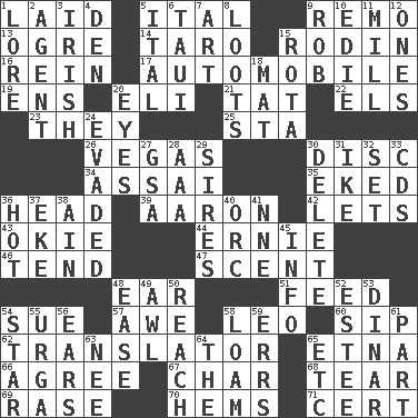 ACROSS 1. Put down 5. Slanted text style (abbr.) 9. San ____ (Riviera town) 13. Legendary monster 14. Edible starchy tuberous root 15. "The Thinker" sculptor 16. It's straight from the horse's mouth 17. Car 19. Followers of ems 20. Connecticut Ivy Leaguer 21. Make lace 22. Raised railways 23. Those things 25. R.R. building 26. Viva Las _ 30. Compact _ 34. Slender Brazilian palm 35. Supplemented with great effort 36. Froth on beer 39. Composer Copland 42. Allows 43. Migrant worker of the '30s 44. Bert's buddy 46. Look after 47. Odor 48. Hearing organ 51. Nourish 54. Institute legal proceedings 57. Deep reverence 58. Lion 60. Small drink 62. Interpreter 65. Inactive volcano in Sicily 66. Match 67. Burn to charcoal 68. Pull into pieces 69. To erase 70. Folds over and sews together 71. Foregone conclusion DOWN 1. Old wives' tales, e.g. 2. Rep 3. From or relating to Ireland 4. Lair 5. Slanted text style (abbr.) 6. "Change" in Tahitian 7. Nonscientific branch of learning 8. Plunders 9. Director Reiner 10. Singer Brickell 11. Place where flour is made 12. Washington bills 15. Roll call or roster of names 18. Floor protector 20. Snake ____ (dice throw) 24. Dodged 27. Girls' org. (abbr.) 28. American Automobile Association (abbr.) 29. Fathers 30. Keyboard key 31. D.D.E's nickname 32. Arrange properly for use 33. Music discs 36. Being at a high temperature 37. Supplement with great effort 38. The 18th letter of the Arabic alphabet 40. The grampus (Milton) 41. Compass dir. 45. Information 48. Relaxation 49. Leather borer 50. Arrive at 52. First name in cosmetics 53. Middle Eastern gold or silver currency 54. Play the lead 55. Capital and largest city of Mongolia 56. Hearing organs 58. Rich soil 59. Blunders 61. Piece 63. Born 64. Definite Article 65. And so on (abbr.)