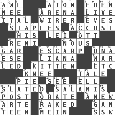 ACROSS 1. Leather borer 4. Smallest unit of an element 8. Paradise 12. Born 13. Sports stadium 14. Not recorded 15. Slanted text style (abbr.) 17. One who wires 18. Nights before holidays 19. Paper fasteners 21. Buttonhole 23. Part of HMS, perhaps 24. Luau accessory 26. Baseball player Mel 27. Painter Guido (1575-1642) 28. Common sense 30. Slender fish 31. Fortification 34. Heredity factor (abbr.) 37. Compass dir. 38. Climbing, woody, usually tropical vines 39. Armed conflict 40. Directed 41. Baby cat 42. And so on (abbr.) 43. Leg joint 44. Falsehood 46. Sliced dessert 47. Observe 50. Pipe bend 51. Scheduled 54. Deli grouping 57. Mail 58. Declaim 60. Afresh 62. Johnson of "Laugh-In" 63. Moved through 64. Separate the seeds from cotton 65. Adolescent 66. Chow _ 67. Compass dir. DOWN 1. Black tropical American cuckoo 2. Moistens 3. Tough but pliablecoriaceous 4. Satellite of Uranus 5. Laconic 6. Single 7. Hindu Mythology: god of death 8. Chooses 9. A piece of turf (Scot.) 10. Nights before holidays 11. A home for chicks 13. Leather borer 16. (Had) reclined 20. Air pressure measure (abbr.) 22. Clever action or accomplishment 25. Empty; void 27. To erase 29. Northwest Algerian city 30. Set 31. Writer Wiesel 32. Settings 33. Feline 34. Homes 35. Nathan's nickname 36. Curve 41. Leg joint 43. Baby cat 44. Beverage made from leaves 45. _ mater 46. Thick mixture 48. 1973 Nobel Price Winner (Physics) Leo 49. Ingested 51. Argument over a trivial matter 52. Old wives' tales, e.g. 53. Dormintory (informal) 55. Directed 56. Oceans 59. Actress Charlotte 61. Compass dir.