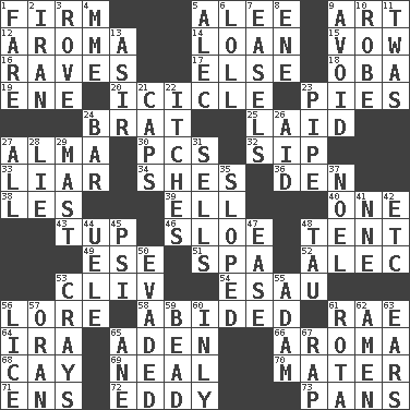 ACROSS 1. Not soft or yielding to pressure 5. Toward shelter 9. Nonscientific branch of learning 12. Scent 14. Grant temporary use of 15. Promise 16. All-night dance parties 17. Otherwise 18. Chief or king in Benin or Nigeria 19. Compass dir. 20. Tapering mass of hanging ice 23. Sliced desserts 24. Naughty child 25. Put down 27. _ mater 30. Personal Computers (abbr.) 32. Small drink 33. One who doesn't tell the truth 34. "______ My Girl" (Turtles hit) 36. Lair 38. French article 39. Pipe bend 40. Single 43. Uncastrated adult male sheep 46. _ gin 48. Portable shelter 49. Compass dir. 51. Health resort 52. Actor Baldwin 53. 154 in Roman numerals 54. Son of Isaac 56. Old wives' tales, e.g. 58. Tolerated 61. Actress Charlotte 64. Retirement account (abbr.) 65. An important port of Yemen 66. Scent 68. Island 69. Anneal 70. Mother 71. Followers of ems 72. Whirlpool 73. Baking dishes DOWN 1. Conductor's collection 2. SW Asia republic 3. Be footloose 4. Madame (abbr.) 5. Actor Baldwin 6. Hang loosely or laxly 7. Artist's stands 8. Compass dir. 9. Prevent from happening 10. Loose flowing garment 11. It was, poetically 13. SW Saudi Arabia district 21. Smile enhancers 22. Skin irritations 23. Corncob 24. Oblong piece of solid material 26. Help 27. 100% 28. Falsehood 29. Vertical spar for supporting sails 31. Exchanges for money 35. Slanted 37. Christmas carol 41. Compass dir. 42. And so on (abbr.) 44. Ubangi River tributary 45. Air pressure measure (abbr.) 47. Relaxation 48. The 19th letter of the Greek alphabet 50. Eluded 53. Trading vessels 55. First of billions? 56. Louse (plural) 57. NW Algerian seaport 59. Necklace unit 60. Inwardly 61. Roll call or roster of names 62. So be it 63. Hearing organs 65. One (Scot) 67. Reproach for some lapse or misdeed