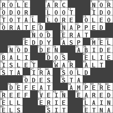 ACROSS 1. Hero or heavy, e.g. 5. Curve 8. Or not 11. Aroma 12. Plunder 14. Wedding promise 15. "_____ Recall" 17. Old wives' tales, e.g. 18. Butter sub 19. Spoke pompously 21. Slept 23. Lower and raise head in agreement 25. Part of Q.E.F. 26. Whirlpool 27. Viper 28. Cartoonist voice _ Blanc 31. Dreamland 33. Lair 35. Stay 37. Indonesian resort city 38. Two (Sp.) 40. Writer Wiesel 41. Small island 43. Armed conflict 45. Keyboard modifier key 46. R.R. building 47. Lyricist Gershwin 50. Disposed of to a purchaser 52. Lyric poems 53. R.R. building 54. Outscore 56. Electrical Unit 61. Coral ridge 62. Distinctive style or manner 65. Having ears or earlike features 66. Pipe bend 67. 4th largest of the Great Lakes 68. (Had) reclined 69. Raised railways 70. Be seated 71. Inactive volcano in Sicily DOWN 1. Printing process, for short 2. Scent 3. Globular water bottle used in Asia 4. Part of Q.E.F. 5. 100% 6. Friend of Pooh 7. Pupil covering 8. "Death on the ____" 9. Wrote a lyric poem 10. Friend of Pooh 13. Rends 16. Grant temporary use of 18. Elect 20. Texas town _ City 22. Dad 24. Colored 26. Singer Brickell 28. Place where flour is made 29. Prepare for publication 30. Area sheltered from the wind 31. Political cartoonist Thomas 32. Spanish pot 34. Immediately 36. Necklace unit 37. Twice 39. Backtalk 42. Periodic rise and fall of the sea level 44. Round or rotation of duties 48. Rob, plunder, or pillage 49. Michaelmas daisies 51. Unable to walk 52. Not in operation 54. Small valley 55. Snakelike fish 57. Diluted with white 58. Part of Q.E.F. 59. It's straight from the horse's mouth 60. Pulitzer Prize-winning author Ferber 61. To sift 63. One more than two 64. Fish or hair follower
