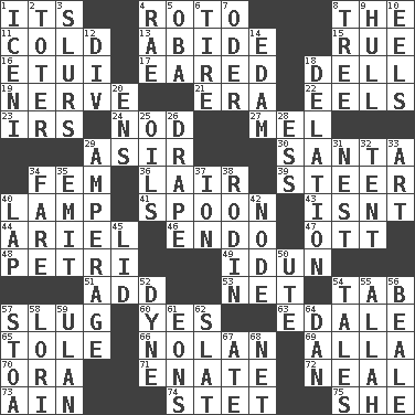 ACROSS 1. It is 4. Printing process, for short 8. Definite Article 11. Lacking warmth 13. Tolerate 15. Sorrow 16. Needle holder 17. Having ears or earlike features 18. Small valley 19. Boldness 21. Epoch 22. Snakelike fish 23. Big collection agency 24. Dreamland 27. Cartoonist voice _ Blanc 29. SW Saudi Arabia district 30. Before Barbara or Clara 34. Opposite of masc. 36. Den 39. Navigate 40. Desk light 41. Soup utensil 43. Is not 44. Satellite of Uranus 46. Inside; within (prefix) 47. Baseball player Mel 48. _ dish (used to culture cells) 49. Goddess of spring and wife of Bragi 51. Say or write further 53. Fish or hair follower 54. Bar bill 57. Strike heavily 60. Consenting reply 63. Peak District village in England 65. Lacquered or enameled metalware 66. Pitcher Ryan 69. Silent film actress Nazimova 70. Mouth or opening 71. Maternal 72. Actress Patricia 73. The 18th letter of the Arabic alphabet 74. Proofreading order 75. A female animal or person DOWN 1. Ancient Celtic tribe of eastern Britain 2. Carrier 3. Runs notes together 4. Actress Charlotte 5. Chief or king in Benin or Nigeria 6. Hoop that covers a wheel 7. Baltic tributary 8. Relationship diagram 9. Frame or body of a ship 10. Snakelike fish 12. HTML Container Element 14. Dutch treat 18. Conveyance 20. Followers of ems 25. Petroleums 26. Window treatment 28. Curvy letter 29. Electrical Measurement 31. A home for chicks 32. Portable shelter 33. Tate display 34. Conductor's collection 35. Give off 37. Electrically charged atom 38. "The Thinker" sculptor 40. Pet locale 42. Connecting point 45. Flaplike covering 50. Shoshoni 52. Unit of force 54. Falsehoods 55. Assad's deity 56. Calif. Air Force Base 57. Portico 58. Australian parrot (variant) 59. ____ Bator, Mongolia 61. Immeasurably long periods of time 62. Narrow board 64. One of the 12 tribes of Israel 67. Had dinner 68. Fish or hair follower