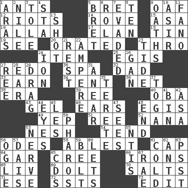 ACROSS 1. Pismires 5. Cy Young winner Saberhagen 9. Clumsy lout 12. Disturbances 14. Be footloose 15. White ___ sheet 16. Assad's deity 17. Flair 18. Metal container 19. Perceive with the eye 20. Spoke pompously 23. Through, poetically 24. A whole individual unit 25. Armor plate that protects the chest 27. Redecorate 30. Health resort 32. June honoree 33. Merit 34. Portable shelter 36. Fish or hair follower 38. Period 39. To sift 40. Chief or king in Benin or Nigeria 43. Set 46. Hearing organs 48. Armor plate that protects the chest 49. Slangy assent 51. Portuguese money of account (variant) 52. Nanny 53. Soft 54. Look after 56. Lyric poems 58. Most capable 61. Head covering 64. Slender fish 65. Algonquian 66. Removes the wrinkles 68. 54 in ancient Rome 69. Dunce 70. Table seasonings 71. Compass dir. 72. Fast planes 73. Prepare for publication DOWN 1. Ancient river in northeast Turkey 2. "Death on the ____" 3. Lacquered or enameled metalware 4. R.R. building 5. Cy Young winner Saberhagen 6. Hero or heavy, e.g. 7. Dodged 8. "___ Little Indians" 9. Curses 10. SW Saudi Arabia district 11. Papal veil 13. Opportunity 21. Take ten 22. Electrical Unit 23. Event that recurs at intervals 24. Electrically charged atom 26. Separate the seeds from cotton 27. Portuguese money of account (variant) 28. Hearing organ 29. To draw with force 31. Approach 35. Cigar-shaped 37. Ancient Roman robe 41. Storage container 42. White ___ sheet 44. Sight organs 45. French article 47. Perceives with the eye 48. Conclude 50. N Egypt peninsula 53. Effrontery 55. Nuclear Threat Initiatives 56. Stare at amorously 57. Raised platform 59. Waist strap 60. Allows 61. Lacking warmth 62. Against 63. Inconspicuous attention getter 65. Music discs 67. Actress Charlotte