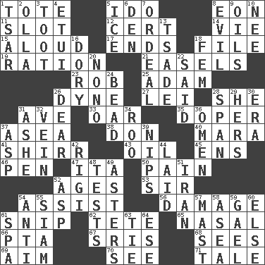 ACROSS 1. Carryall 5. Wedding promise 8. Period of immesurable duration 11. Slit 12. Sure thing 14. Compete 15. Verbally 17. Extremities 18. Do some clerical work 19. Food allowance for one day 21. Artist's stands 23. Director Reiner 25. First of billions? 26. Centimeter-gram-second unit of force 27. Luau accessory 28. A female animal or person 31. "___ Maria" 33. Boat paddle 35. Drug addict 37. Toward the sea 38. Spanish title 40. Hindu Mythology: god of death 41. Bake eggs in their shells 43. Lubricate 45. Followers of ems 46. Animal enclosure 47. Call ___ day 50. Ache 52. Ripens 53. Title for a knight 54. Help 56. Break 61. Clip 62. False hair 65. Rhinal 66. Parent Teacher Association (abbr.) 67. Indian titles of respect 68. Observes 69. Direct toward a target or goal 70. Observe 71. Story DOWN 1. Russian ruler of old 2. Water jar 3. A blast of a horn 4. Needle case 5. Frozen water 6. Lair 7. Severe or trying experience 8. Morally bad or wrong 9. Petroleums 10. Born 13. Sadhe (variant) 16. Rowboat 18. Opposite of masc. 20. Words to Nanette 22. Alleged 24. Necklace unit 26. Letter starter 28. Connect, as a bridge 29. Possessive pronoun 30. Epoch 31. American tennis player Robert 32. Distinctive style or manner 34. Friend of Pooh 36. Presage 37. Cleo's killer 39. Pinches, bites 42. Swiss mountan, "Queen of the Mountains" 44. Put down 48. Trials 49. Michaelmas daisies 51. SW Asia republic 52. Cleo's killer 54. Against 55. Thailand, formerly 57. Vertical spar for supporting sails 58. Toward the sea 59. Highlander 60. Otherwise 61. Health resort 63. Neckwear 64. Compass dir.