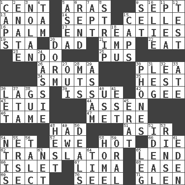 ACROSS 1. Penny 5. Caspian sea tributary 9. Back-to-school mo. 13. Small Philippine buffalo 14. Back-to-school mo. 15. Cell (Danish) 16. Inside of hand 17. Pleas 19. R.R. building 20. June honoree 21. Mischievous child 22. Ingest 23. Inside; within (prefix) 25. Festering 26. Scent 30. Entreaty 34. Particles of soot 35. Behest 36. Fails to keep up a pace 39. Come out of 42. Double curve, resembling the letter S 43. Needle case 44. NE Netherlands city 46. Docile 47. Distance measurement (Brit.) 48. Possessed 51. SW Saudi Arabia district 54. Fish or hair follower 57. She-sheep 58. Being at a high temperature 60. Expire 62. Interpreter 65. Grant temporary use of 66. Small island 67. Pale green bean 68. Relaxation 69. Religious group 70. Stitch closed the eyes of (a falcon) 71. Small, secluded valley DOWN 1. Balmoral and tarboosh 2. Related on the mother's side 3. Pitcher Ryan 4. Scottish cap 5. At sea 6. Tear apart 7. Fitting 8. Long narrow piece of something 9. Arrange properly for use 10. Writer Wiesel 11. Entreaty 12. Trial 15. Balmoral and tarboosh 18. Australian flightless bird 20. Dormintory (informal) 24. Small ungulate mammals of Africa 27. Fr. "Yes" 28. Mountains (abbr.) 29. Indian state 30. Gives a jingle 31. Part of a journey 32. Compass dir. 33. Had dinner 36. Allow 37. _ moment's notice (2 wds.) 38. Chewing product 40. Purpose 41. Eastern Standard Time (abbr.) 45. Part of Q.E.F. 48. Command 49. Leather borer 50. Allots cards 52. Perfect 53. Remove soap 54. Nuclear Threat Initiatives 55. Celtic language 56. Baby powder 58. Residence 59. Spoken 61. Genesis locale 63. Fish or hair follower 64. Make a knot 65. Part of a journey