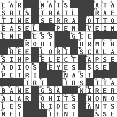 ACROSS 1. Ewer handle 4. Floor coverings 8. "One Day ___ Time" 11. Indian titles of respect 13. Hang back 15. Actress Charlotte 16. Prong on a fork 17. Spanish missionary in California 18. "Beetle Bailey" pooch 19. Artist's stand 21. Animal enclosure 22. Distinctive style or manner 23. Compass dir. 24. Curvy letter 27. Unit of force equal to gravity 29. Carrot, for example 30. Channel Islands abalone 34. To riddle 36. Australian parrot (variant) 39. Any of the three canals of the cochlea 40. Simple or foolish person 41. Opt 43. Domed church section 44. Goodbye (Sp.) 46. Snake ____ (dice throw) 47. Compass dir. 48. _ dish (used to culture cells) 49. Political cartoonist Thomas 51. Three (prefix) 53. Big collection agency 54. Call ___ day 57. Object of repulsion 60. Girls' org. (abbr.) 63. One who wires 65. Having or resembling wings 66. Leaves out 69. Words to Nanette 70. French article 71. Amusement-park features 72. Pismires 73. Was introduced to 74. Portable shelter 75. Compass dir. DOWN 1. First name in cosmetics 2. Believer in; advocate of (suffix) 3. Remove soap 4. Mountains (abbr.) 5. "We ___ not amused" (Victoria) 6. Canvas cover 7. Title for a man of rank and authority 8. Johnson of "Laugh-In" 9. Jacques of French films 10. Period of immesurable duration 12. Perceive with the eye 14. Long (Scottish) 18. Cloudy 20. Lion 25. Not divided or shared with others 26. Took without asking 28. Greek goddess of the dawn 29. News announcer 31. Atlas contents 32. Otherwise 33. Actress Charlotte 34. Travel on an animal 35. Send forth 37. Marina Del _, California 38. Ancient Celtic tribe of eastern Britain 40. Plant excrement 42. Russian ruler of old 45. Title for a knight 50. Compass dir. 52. Russian composer Stravinsky 54. Removes the wrinkles 55. Portable shelters 56. Came up 57. Lip ointment 58. Toward shelter 59. Political cartoonist Thomas 61. Stricken, poetically 62. Assistant 64. _ tizzy (2 wds.) 67. "___ Little Indians" 68. Fast jet (abbr.)