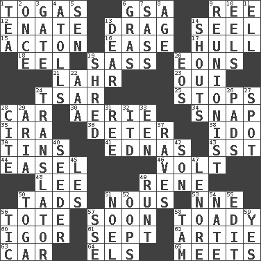 ACROSS 1. Ancient Roman robes 6. Girls' org. (abbr.) 9. To separate or throw off 12. Maternal 13. To draw with force 14. Stitch closed the eyes of (a falcon) 15. 13-14th century defensive garment 16. Comfort 17. Frame or body of a ship 18. Snakelike fish 19. Backtalk 20. Immeasurably long periods of time 21. Cowardly lion portrayer 23. Fr. "Yes" 24. Russian ruler of old 25. Halts 28. Automobile 30. Nest on high 34. Fastener 35. Retirement account (abbr.) 36. Prevent from occurring 38. Wedding promise 39. Airtight sealed metal containers 41. Ferber et al. 43. Fast jet (abbr.) 44. Artist's stand 46. Electrical Unit 48. Area sheltered from the wind 49. French philosopher Descartes 50. Bits 51. Common sense 53. Compass dir. 56. Lug 57. Within a short period 58. Sycophant 60. Composer Stravinsky 61. Back-to-school mo. 62. Nick name for Arthur 63. 4-wheeled motor vehicle 64. Raised railways 65. Confronts DOWN 1. Afternoon social gathering 2. At one time in the past 3. Yard entry 4. Ringlike coral islands and reefs 5. Elected rep. 6. Pate de foie ____ 7. Backtalk 8. Ripen 9. One who advocates reunion 10. Snakelike fish 11. Pipe bend 13. Letter starter 14. Yells 19. Fragment 20. Greek goddess of the dawn 22. American Automobile Association (abbr.) 24. Interpreter 26. Groovy apts. 27. Blemish 28. Quote 29. Roberta Peters solo 31. To riddle 32. It would 33. Car or cant ending 37. All-night dance parties 40. Sowing specialist 42. Boy, to dad 45. French article 47. Poe poem 49. The smallest animal of a litter 50. Ancient Roman robe 51. Christmas carol 52. I made a mistake 54. Nathan's nickname 55. Prepare for publication 56. Nervous spasm 57. Compass dir. 58. Scottish cap 59. It is so