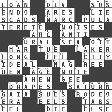 ACROSS 1. Grant temporary use of 5. HTML Container Element 8. Mayday 11. Inside; within (prefix) 12. Ancient Greek god of war 14. Whopper 15. Large numbers or amounts 17. Drug cop 18. Monetary unit of Botswana 19. Cylindrical with tapered ends 21. Annoying sounds 23. Curve 25. Against 26. Mountain range 27. Ocean 28. Baseball player Mel 31. Spoil 33. Third day of the wk. 35. Member of a famous L.A. basketball team 37. Having great length 38. Snakelike fish 40. Municipality 41. Standard of perfection 43. Tired old horse 45. To sift 46. Morning condensation 47. Ripen 50. Make mention of 52. So be it 53. Unit of force equal to gravity 54. Window treatments 56. Titan orbits this 61. Greek goddess of the earth (variant) 62. Takes to court 65. Cowboy competition 66. Epoch 67. Snakelike fish 68. Bar bills 69. Snakelike fish 70. Expire 71. Otherwise DOWN 1. For fear that 2. At one time in the past 3. The sixth month of the Jewish calendar 4. Connecting point 5. Daniel's nick name 6. Retirement account (abbr.) 7. Actresses Bloom and Felton 8. Turn sharply 9. Lubricates 10. Ocean 13. Biscuitlike quick bread 16. Play the lead 18. Air pressure measure (abbr.) 20. Part of Q.E.F. 22. Slanted text style (abbr.) 24. A slight indication 26. Capital and largest city of Mongolia 28. Migrant worker of the '30s 29. False hair 30. Attempt 31. Method 32. Afresh 34. Car or cant ending 36. Measure of real estate 37. Flaplike covering 39. Austrian-born American filmmaker Fritz 42. Desk light 44. Moves 48. Honkers 49. Took place subsequently 51. Pull into pieces 52. American Automobile Association (abbr.) 54. Have the gumption 55. Monetary unit of Yemen 57. Lug 58. Allodial 59. Confederate soldiers (slang) 60. Sense of smell 61. Turn to the right 63. Connecticut Ivy Leaguer 64. Compass dir.