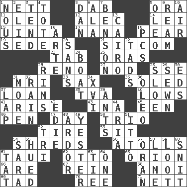 ACROSS 1. Remaining after all deductions 5. Pat or tap gently 8. Mouth or opening 11. Margarine 12. Actor Baldwin 14. Flowery wreath 15. National forest in Provo, Utah 17. Nanny 18. Lightbulb-shaped fruit 19. Spring feasts 21. "Cheers" or "Ellen" 23. Bar bill 25. Mouths or openings 26. Western Nevada city 27. Allow head to fall sleepily 28. Compass dir. 31. Medical imaging device (abbr.) 33. Saxophone 35. Having a sole or soles 37. Rich soil 38. Federal power corp. 40. Moos 41. Originate 43. _ tizzy (2 wds.) 45. Car or cant ending 46. Animal enclosure 47. 24 hours 50. Musical group of three 52. Hoop that covers a wheel 53. Be seated 54. Fragments 56. Ringlike coral islands and reefs 61. "Change" in Tahitian 62. Von Bismarck 65. Greek mythologigal hunter 66. "We ___ not amused" (Victoria) 67. It's straight from the horse's mouth 68. Mine, in Marseilles 69. Small boy 70. To separate or throw off 71. Remaining after all deductions DOWN 1. Common sense 2. Writer Wiesel 3. Look after 4. Lug 5. Daniel's nick name 6. Wing 7. Gillaume's butler role 8. Margarine 9. 480, 500 or 516 sheets of paper 10. Atmosphere 13. Capital of Egypt 16. Johnson of "Laugh-In" 18. Personal Computers (abbr.) 20. Without 22. Small boys 24. Water vessel 26. Basketball hoops 28. _ gin 29. Stitched 30. Begley and Asner 31. Greater amount 32. Water falling in drops from the sky 34. 16 36. Margarine 37. Pet locale 39. Pismires 42. Singer Brickell 44. Operatic vocal solo 48. Zeal 49. Last past 51. "Tell ____ the Marines!" 52. Three (prefix) 54. "Two Mules for Sister ____" 55. Took on color 57. Northwest Algerian city 58. Welles in "The Third Man" 59. Spoils 60. In a ____ (agitated or irritated) 61. Make lace 63. Make a knot 64. Single