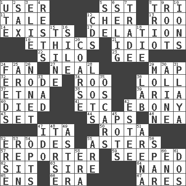 ACROSS 1. One who makes use of a thing 5. Fast jet (abbr.) 8. Three (prefix) 11. Lie 12. "Mermaids" star 13. Friend of Pooh 14. Is extant 17. Conveyance 19. Principles of right and wrong 21. Foolish or stupid persons 22. Grain storage tower 23. Unit of force equal to gravity 24. Avid follower 27. Be tempered by heat 29. Atlas unit 32. Wear away 34. Friend of Pooh 36. Hang loosely or laxly 37. Inactive volcano in Sicily 38. Mayday 39. Roberta Peters solo 40. Passed on 41. And so on (abbr.) 42. Dark wood 43. Arrange properly for use 44. Plant excrements 46. Teachers' org. 47. Call ___ day 50. Round or rotation of duties 52. Eats (away) 55. Michaelmas daisies 57. News announcer 59. Oozed 62. Be seated 63. Title for a man of rank and authority 64. Billionth: prefix 65. Followers of ems 66. Period 67. Ancient Greek god of war DOWN 1. Shoshoni 2. Saxophone 3. Writer Wiesel 4. Musical pauses 5. A female animal or person 6. Major League Baseball Commissioner Bud 7. Exchange 8. Musical group of three 9. Carrot, for example 10. Charged particles 12. Music discs 15. One or ones belonging to thee 16. Drop; flow; fall 18. Standoff 20. Rough 24. Eats 25. Nick name for Arthur 26. Music written for nine 28. Plunders 29. Person of subnormal intelligence 30. Place in a line 31. Beach, in Buenos Aires 33. Male parent 35. Motion picture awards 36. Experiment locale 42. First name in cosmetics 45. Plant holders 47. Wedding promise 48. Laconic 49. Moving or stirring 51. Sports stadium 52. Celtic language 53. It's straight from the horse's mouth 54. Elects 55. "We ___ not amused" (Victoria) 56. Practice fight 58. Period 60. Compass dir. 61. Two (Sp.)