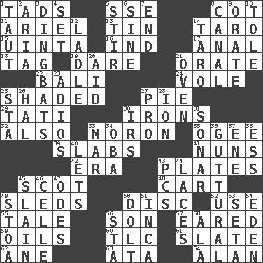 ACROSS 1. Small amounts or degrees 5. Compass dir. 8. Small bed 11. Satellite of Uranus 13. Metal container 14. Edible starchy tuberous root 15. National forest in Provo, Utah 16. Indiana (abbr.) 17. Of or related to the anus 18. Label 19. Have the gumption 21. Declaim 22. Indonesian resort city 24. Short-tailed, large-bodied rat 25. Cast a shadow over 27. Sliced dessert 29. Jacques of French films 30. Removes the wrinkles 32. In addition 33. Person of subnormal intelligence 35. Double curve, resembling the letter S 39. Broad, flat, thick pieces 41. Religious women 42. Epoch 43. Food holders 45. Native of Scotland 48. Draw slowly or heavily 49. Bobsleighs 50. Plate 52. Purpose 55. Story 56. Male child 57. Having ears or earlike features 59. Petroleums 60. Affectionate concern, for short 61. Chalkboard 62. One (Scot) 63. _ moment's notice (2 wds.) 64. ____ Jay Lerner DOWN 1. Pulled tight 2. Operatic vocal solo 3. Empty-headed or silly people 4. Put into a specified state 5. Use a spoon 6. Trig term 7. Conclusion 8. Lessep's creation 9. Declaim 10. Lacquered or enameled metalware 12. Dipping utensil 14. Pacific island yam 20. Assist 21. Baking chamber 23. Goodbye (Sp.) 25. R.R. building 26. Actor Linden 27. Adept person 28. Electrically charged atom 30. Big collection agency 31. Underwater navigation system 33. Make imperfect 34. Chief or king in Benin or Nigeria 36. From the throat 37. Compass dir. 38. Double-curved letter 40. Allows 43. Personal Computers (abbr.) 44. Shoestrings 45. Killed 46. Cell (Danish) 47. Lyric poems 49. Portico 50. Dunce 51. South American Indian 53. Stalk of a moss capsule 54. Locale of original sin 56. R.R. building 58. Chicken ___ king