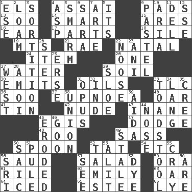 ACROSS 1. Raised railways 4. Slender Brazilian palm 9. Writing tablets 13. "Barney Miller" actor Jack 14. Don Adams' spy role 15. Ancient Greek god of war 16. Hearing organ 17. Actors' quests 18. Drop; flow; fall 19. Mountains (abbr.) 21. Actress Charlotte 22. Relating to or accompanying birth 24. A whole individual unit 26. Single 27. Wetness 29. The visible part of the earth's surface 30. Sends forth 31. Petroleums 33. Affectionate concern, for short 36. "Barney Miller" actor Jack 37. Normal relaxed breathing 40. Rowing implement 41. Shallow baking pan 42. Naked 43. Silly 45. The front part of a cuirass 47. Evade 48. Friend of Pooh 49. Backtalk 50. Soup utensil 52. Make lace 54. And so on (abbr.) 56. Saudi Arabian king (1953-1964) 57. First course 59. Mouth or opening 61. Cause heat under the collar 62. Poet Dickinson 63. Boat paddle 64. On the rocks 65. First name in cosmetics 66. Potassium hydroxide DOWN 1. Compass dir. 2. Rich soil 3. Casting lots 4. Viper 5. Excessive but superficial compliments 6. "Two Mules for Sister ____" 7. Johnson of "Laugh-In" 8. ___ a Wonderful Life 9. Soft color 10. Roberta Peters solo 11. Small valley 12. Compass dir. 20. Proofreading order 22. Trap for birds or small mammals 23. Black tropical American cuckoo 25. Celtic language 27. Compass direction 28. Mine, in Marseilles 29. A type of plum 31. Musical composition 32. Working for oneself (abbr.) 33. Inedible or poisonous agaric 34. Austrian-born American filmmaker Fritz 35. Algonquian 38. The state of being joined or united 39. Opera by Verdi 44. Characteristic smell of wine 45. Eaten away 46. Thick or sticky substance 49. Showing deterioration from age 50. Ketch in the Levant 51. Whimper 52. Scottish caps 53. Set down 55. Supercomputer manufacturer 56. Indian title of respect (Mr.) 57. Observe 58. Color 60. "We ___ not amused" (Victoria)