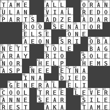ACROSS 1. Not wild 5. 100% 8. Northwest Algerian city 12. Uhlan (variant) 13. Small bottle 15. Do over again 16. Actors' quests 18. Axlike tool, used for shaping wood 19. The sixth month of the Jewish calendar 20. Friend of Pooh 22. Elected representative 24. Otherwise 26. Single 27. A really long time 28. Indian title of respect (Mr.) 29. Chief or king in Benin or Nigeria 32. Remaining after all deductions 35. Lacquered or enameled metalware 37. Paper or plastic container 38. Like ___ of sunshine 39. _ de Janeiro 40. Flatfish 41. Or not 42. Aid 43. Is hesitant and indecisive 44. Cleo's killer 45. Born 46. Inactive volcano in Sicily 49. _ tizzy (2 wds.) 50. Passed on 51. Commissioned military rank 55. Connecticut Ivy Leaguer 56. Calm and collected 57. Relationship diagram 59. Crowbar 63. Queen of England 1702-14 64. Scorch 65. Drop; flow; fall 66. State of inaction 67. Alias (abbr.) 68. Docile DOWN 1. Uncastrated adult male sheep 2. Chicken ___ king 3. Impair 4. Plea 5. Actress Gardner 6. Flaplike coverings 7. Goldbrick 8. Declaim 9. Do over again 10. The sixth month of the Jewish calendar 11. And not 14. Poe poem 17. Flatfish 21. Bear (Spanish) 23. Black tropical American cuckoo 25. Main course 28. Had an oblique or slanted direction 29. Mitch Miller's instrument 30. Lip ointment 31. Ripens 32. Grandmother 33. Greek god of love 34. Canvas cover 36. Petroleum 40. Most dark, concealed or hidden 42. Centers of feelings and intuitions 45. Compass dir. 47. Make a knot 48. 1994 drama film starring Jodie Foster 49. An arm off of a larger body of water 51. Went 52. Immeasurably long periods of time 53. Type of rug 54. Path through which fluid escapes 56. 4-wheeled motor vehicle 58. Epoch 60. By way of 61. Shade tree 62. To sift