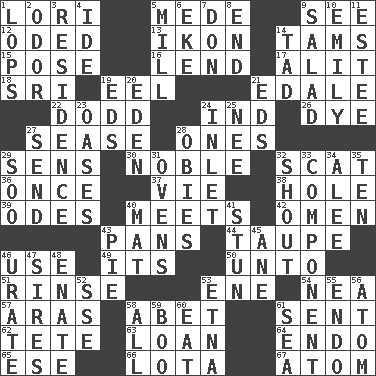 ACROSS 1. Australian parrot (variant) 5. Ancient Persian 9. Perceive with the eye 12. Wrote a lyric poem 13. Image 14. Scottish caps 15. Airs 16. Grant temporary use of 17. Came down and settled, as after flight 18. _ Lanka 19. Snakelike fish 21. Peak District village in England 22. Texas town _ City 24. Indiana (abbr.) 26. Color 27. Gospel singer Marvin 28. Washington bills 29. Elected reps. 30. Impressive in appearance 32. Get outta here! 36. Single time 37. Compete 38. Hollow 39. Lyric poems 40. Confronts 42. Sign of something about to happen 43. Zero-star reviews 44. Grayish beige 46. Purpose 49. ___ a Wonderful Life 50. To (old English) 51. Remove soap 53. Compass dir. 54. Teachers' org. 57. Ancient river in northeast Turkey 58. Collude with 61. Transmitted 62. Wig 63. Grant temporary use of 64. Inside; within (prefix) 65. Compass dir. 66. Globular water bottle used in Asia 67. Tiny particle DOWN 1. Chops off 2. Scent 3. Dwelling 4. Binary compound 5. Place where flour is made 6. Supplement with great effort 7. Spanish title 8. Conclude 9. Vegetable dish 10. Poet Dickinson 11. First name in cosmetics 14. Bit 19. Begley and Asner 20. Paradise 21. Begley and Asner 23. Fertile tracts in a desert 24. An arm off of a larger body of water 25. Born 27. Transmit 28. Off-Broadway awards 29. "Barney Miller" actor Jack 31. Baking chambers 32. Yell 33. Part 34. Toward shelter 35. Nine, plus one 40. Floor covering 41. Astound 43. Sliced dessert 45. One (Scot) 46. A salt of uric acid 47. Begets 48. Maternal 52. Compass dir. 53. Inactive volcano in Sicily 55. Inside; within (prefix) 56. Smallest unit of an element 58. 100% 59. Surprise greeting 60. Erode 61. Ocean