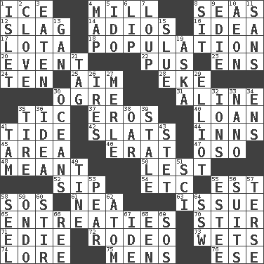 ACROSS 1. Frozen water 4. Place where flour is made 8. Oceans 12. Volcanic refuse 14. Goodbye (Sp.) 16. It may be bright or harebrained 17. Globular water bottle used in Asia 18. Census information 20. Happening 22. Festering 23. Followers of ems 24. "___ Little Indians" 25. Direct toward a target or goal 28. Supplement with great effort 30. Legendary monster 31. Place in a line 35. Nervous spasm 37. Greek god of love 40. Grant temporary use of 41. Periodic rise and fall of the sea level 42. Narrow boards 44. Restaurants 45. Type of rug 46. Part of Q.E.F. 47. Bear (Spanish) 48. Intended 50. For fear that 52. Small drink 54. And so on (abbr.) 55. Eastern Standard Time (abbr.) 58. Mayday 61. Teachers' org. 63. Come out of 65. Pleas 70. Agitate 71. Singer Brickell 72. Cowboy competition 73. Soaks 74. Old wives' tales, e.g. 75. Not women's 76. Compass dir. DOWN 1. Small island 2. Garlic unit 3. Consumed 4. Atlas unit 5. Wedding promise 6. Mouth edge 7. Central Nebraska county 8. Be seated 9. Singer Brickell 10. Period of immesurable duration 11. Without 13. Separate the seeds from cotton 15. Change direction abruptly 19. "____ silly question..." 21. Label 26. Angers 27. Haggard of country music 29. American author Paul (1891-1958) 30. Seas 32. Charged particles 33. Billionth: prefix 34. Followers of ems 35. Hoop that covers a wheel 36. The main thing one is thinking about 38. Rowing implement 39. Showing deterioration from age 41. Scottish cap 43. Proofreading order 49. Prong on a fork 51. _-fi 53. Lightbulb-shaped fruit 55. First name in cosmetics 56. Sets or collections 57. Laconic 58. Sew up the eyelids of hawks and falcons 59. Southwest Nigerian state 60. Tumult 62. Tiny particle 64. Compass dir. 66. To sift 67. Binary compound 68. Car or cant ending 69. Mayday