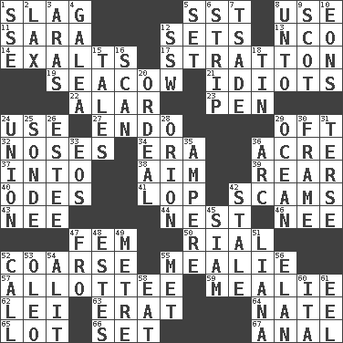 ACROSS 1. Volcanic refuse 5. Fast jet (abbr.) 8. Purpose 11. "Two Mules for Sister ____" 12. Puts into a specified state 13. Non-commissioned officer (abbr.) 14. Honors 17. Ski resort town in Vermont 19. Manatee 21. Foolish or stupid persons 22. Having or resembling wings 23. Fenced enclosure 24. Purpose 27. Inside; within (prefix) 29. Often (poetically) 32. Olfactory organs 34. Period 36. Measure of real estate 37. To the inside or interior of 38. Direct toward a target or goal 39. Posterior 40. Lyric poems 41. Trim (branches) 42. Fraudulent business schemes 43. Born 44. A home for chicks 46. Born 47. Opposite of masc. 50. Monetary unit of Yemen 52. Unrefined 55. Ear of corn 57. One to whom something is allotted 59. Ear of corn 62. Flowery wreath 63. Part of Q.E.F. 64. Nathan's nickname 65. Car dealer's back yard 66. Put into a specified state 67. Of or related to the anus DOWN 1. Compass dir. 2. Not strict 3. Caspian sea tributary 4. An organ shaped like a helmet 5. Arrange properly for use 6. Remove all contents or possession from 7. Sadhe (variant) 8. To (old English) 9. Native of Scotland 10. Immeasurably long periods of time 12. Compass dir. 15. Lies 16. Skim 18. Metal container 20. Severe or trying experience 24. The state of being joined or united 25. Something which is sent 26. First name in cosmetics 28. Greek mythologigal hunter 29. Sea 30. Movie unit 31. Laconic 33. Greek goddess of the dawn 35. Electrical Unit 36. Curve 42. Having lost freshness 45. Thailand, formerly 47. Away 48. _____ Park, CO 49. Distance measurement (Brit.) 51. Woody, climbing, usually tropical plant 52. Give a ring to 53. Margarine 54. Set down 55. Was introduced to 56. Style 58. Erode 60. Call ___ day 61. Snakelike fish