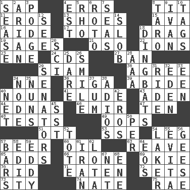 ACROSS 1. Plant excrement 4. Blunders 8. Teat (slang) 11. Greek god of love 13. Imelda's hoard 15. Actress Gardner 16. Assistant 17. "_____ Recall" 18. To draw with force 19. Gurus 21. Bear (Spanish) 22. Charged atoms 23. Compass dir. 24. Music discs 27. Bar 29. Thailand, formerly 30. Match 34. Compass dir. 36. Capital of Latvia 39. Stay 40. Part of speech 41. Evade 43. Arabian gulf 44. Ferber et al. 46. Independent ruler or chieftain 47. "___ Little Indians" 48. Trials 49. I made a mistake 51. Baseball player Mel 53. Compass dir. 54. Part of a journey 57. Fermented drink made from hops 60. Lubricate 63. Break or tear apart 65. Sums up 66. Heavy duty weighing machine 69. Migrant worker of the '30s 70. To free from 71. Eroded 72. Puts into a specified state 73. Filthy place 74. Nathan's nickname 75. Actress Charlotte DOWN 1. Gospel singer Marvin 2. Believer in; advocate of (suffix) 3. Porridge 4. Eastern Standard Time (abbr.) 5. 17th letter of the Greek alphabet 6. Printing process, for short 7. Oceans 8. Edible starchy tuberous root 9. "Terrible" tsar 10. Labels 12. Perceive with the eye 14. Oscar Madison type 18. Empty-headed or silly people 20. _-fi 25. Have the gumption 26. Grin 28. American Automobile Association (abbr.) 29. Legislators 31. Travel on an animal 32. Locale of original sin 33. Car or cant ending 34. Thickened enlargement 35. Religious women 37. Chewing product 38. Goodbye (Sp.) 40. Fish or hair follower 42. Greek god of love 45. Fast jet (abbr.) 50. For each 52. Carry 54. Member of a famous L.A. basketball team 55. Webber/Rice musical 56. Honkers 57. Soap units 58. Prepare for publication 59. Whirlpool 61. SW Asia republic 62. Globular water bottle used in Asia 64. Greek goddess of the dawn 67. Fish or hair follower 68. Compass dir.