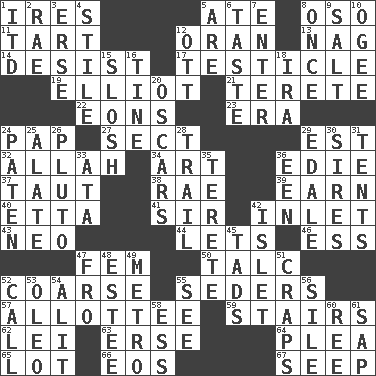 ACROSS 1. Angers 5. Had dinner 8. Bear (Spanish) 11. Small pie 12. Northwest Algerian city 13. Tired old horse 14. Cease 17. One of the two male reproductive glands 19. American author Paul (1891-1958) 21. Cylindrical with tapered ends 22. Immeasurably long periods of time 23. Period 24. Infant food 27. Religious group 29. Eastern Standard Time (abbr.) 32. Assad's deity 34. Tate display 36. Singer Brickell 37. Strained 38. Actress Charlotte 39. Merit 40. Singer James 41. Title for a knight 42. An arm off of a larger body of water 43. Modern: prefix 44. Allows 46. Curvy letter 47. Opposite of masc. 50. Baby powder 52. Rough 55. Spring feasts 57. One to whom something is allotted 59. Flight of steps 62. Luau accessory 63. Celtic language 64. Entreaty 65. Car dealer's back yard 66. Greek goddess of the dawn 67. Ooze DOWN 1. It would 2. Actress Charlotte 3. Celtic language 4. Vertical member of a panel or frame 5. "We ___ not amused" (Victoria) 6. Clothes sense 7. Keyboard key 8. At one time in the past 9. Table seasoning 10. Double curve, resembling the letter S 12. Baseball player Mel 15. Make a splashing sound 16. Prong on a fork 18. Lyricist Gershwin 20. Motion picture awards 24. Eucharist need 25. Having winglike extensions 26. Mickey's pet 28. Go after with the intent to catch 29. Peak District village in England 30. Titles for men of rank and authority 31. Portable shelters 33. "One Day ___ Time" 35. Cigar-shaped 36. Car or cant ending 42. Small island 45. Bits 47. Back 48. First name in cosmetics 49. Paris' subway 51. Dice game 52. Give a ring to 53. Margarine 54. Set down 55. Perceive with the eye 56. Filth; sediment 58. Curvy letter 60. To riddle 61. Plant excrement