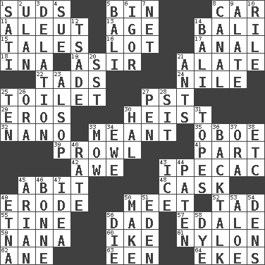 ACROSS 1. Soap bubbles 5. Storage container 8. 4-wheeled motor vehicle 11. Eskimo relative 13. Ripen 14. Indonesian resort city 15. Lies 16. Car dealer's back yard 17. Of or related to the anus 18. _ tizzy (2 wds.) 19. SW Saudi Arabia district 21. Having winglike extensions 22. Bits 24. Mediterranean tributary 25. Rest room 27. Pacific Standard Time (abbr.) 29. Greek god of love 30. Robbery 32. Billionth: prefix 33. Intended 35. Mitch Miller's instrument 39. Move like a hungry wolf 41. Role in a play 42. Deep reverence 43. Medicinal drug used to evoke vomiting 45. "This won't hurt ____!" 48. Keg 49. Eat (away) 50. Rendezvous 52. Bit 55. Prong on a fork 56. June honoree 57. Peak District village in England 59. Grandmother 60. D.D.E's nickname 61. Thermoplastic polyamide 62. One (Scot) 63. Car or cant ending 64. Makes supply last DOWN 1. Suttee (variant) 2. Uhlan (variant) 3. Accusation by an informer 4. Institute legal proceedings 5. Indonesian resort city 6. Russian composer Stravinsky 7. Fish or hair follower 8. Lessep's creation 9. Having winglike extensions 10. Cause heat under the collar 12. Sadhe (variant) 14. Indonesian resort city 20. Fast jet (abbr.) 21. Pismires 23. Columnist Joseph or Stewart 25. "___ Little Indians" 26. Mouth or opening 27. Fenced enclosure 28. Be seated 30. Actor Linden 31. Drinks excessively 33. Cut the grass 34. She-sheep 36. Sass 37. Mouth or opening 38. And so on (abbr.) 40. Pace 43. Frozen water 44. Eucharist need 45. Believer in; advocate of (suffix) 46. Maid-servant 47. The content of cognition 49. Inactive volcano in Sicily 50. Cause to be 51. Genesis locale 53. _ vera 54. Cub Scout units 56. Expire 58. Color