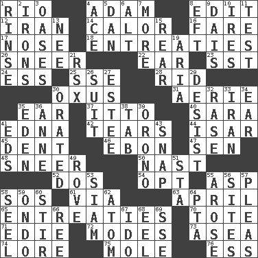 ACROSS 1. _ de Janeiro 4. First of billions? 8. Prepare for publication 12. SW Asia republic 14. Bodily heat indicating an inflammation 16. Conductor's collection 17. Olfactory organ 18. Pleas 20. Scornful expression 22. Ewer handle 23. Fast jet (abbr.) 24. Curvy letter 25. Compass dir. 28. To free from 30. The longest river in Central Asia 31. Nest on high 35. Ewer handle 37. "Tell ____ the Marines!" 40. "Two Mules for Sister ____" 41. Pulitzer Prize-winning author Ferber 42. Lacerates 44. Astrian river, tributary to the Danube 45. Scratch 46. Inky black, to poets 47. Elected rep. 48. Contemptuous expression 50. Political cartoonist Thomas 52. Two (Sp.) 54. Choose 55. Cleo's killer 58. Mayday 61. By way of 63. Showery time 65. Pleas 70. Carry 71. Singer Brickell 72. Methods 73. Toward the sea 74. Old wives' tales, e.g. 75. Undercover agent 76. Curvy letter DOWN 1. Wash lightly 2. Removes the wrinkles 3. Fertile tracts in a desert 4. Adept person 5. Daniel's nick name 6. The first octave above the treble staff 7. Greater amount 8. Newt 9. Raised platform 10. Angers 11. Trial 13. Born 15. Hitchcock's "____ Window" 19. Operatic vocal solo 21. Acura sports coupe 26. Set or collection 27. First name in cosmetics 29. Cease 30. Declaimed 32. Raze (variant) 33. SW Asia republic 34. Hearing organ 35. Paradise 36. Singer Murray 38. Keyboard key 39. U. of Maine site 41. Begley and Asner 43. Fastener 49. Be footloose 51. R.R. building 53. Thailand, formerly 55. Came up 56. Locates 57. Entreaties 58. Stitch closed the eyes of (a falcon) 59. Southwest Nigerian state 60. Tumult 62. Tiny particle 64. Parent Teacher Assoc. 66. To sift 67. Wedding promise 68. Snakelike fish 69. Compass dir.