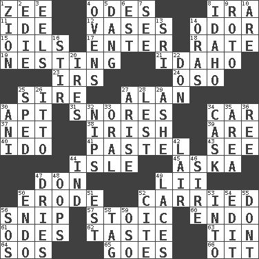 ACROSS 1. Last letter of the English alphabet 4. Lyric poems 8. Retirement account (abbr.) 11. Binary compound 12. Flower holders 14. Scent 15. Petroleums 17. Keyboard key 18. Pace 19. Snuggling 21. Potato state 23. Big collection agency 24. Bear (Spanish) 25. Male parent of an animal 27. Actor Alda or Thicke 30. Fitting 31. Sounds asleep 34. 4-wheeled motor vehicle 37. Fish or hair follower 38. From or relating to Ireland 39. "We ___ not amused" (Victoria) 40. Wedding promise 41. Soft color 43. Perceive with the eye 44. Small island 45. "____ silly question..." 47. Spanish title 49. Cards in a Roman deck? 50. Eat (away) 52. Borne 56. Sever or remove by pinching or nipping 57. Unemotional 60. Inside; within (prefix) 61. Lyric poems 62. Clothes sense 63. Metal container 64. Distress signal 65. Moves 66. Baseball player Mel DOWN 1. The Jewish people; Israel 2. Singer Brickell 3. Snakelike fish 4. Baking chambers 5. Mild oath, euphamism for damn 6. Eastern Standard Time (abbr.) 7. Perceive with the eye 8. Potato state 9. Printing process, for short 10. "We ___ not amused" (Victoria) 13. _ Lanka 14. Mouths or openings 16. Commotion 20. Angers 22. Spanish title 25. Hurried 26. "Tell ____ the Marines!" 27. Originate 28. For fear that 29. American tennis player Robert 30. Black tropical American cuckoo 32. Pinches, bites 33. Of the mouth 34. Keg 35. Type of rug 36. To sift 42. Den 44. Working for oneself (abbr.) 46. Father 47. Frees from moisture 48. I made a mistake 49. Shoestrings 50. Inside; within (prefix) 51. Eastern Standard Time (abbr.) 52. Quote 53. To the inside or interior of 54. Prepare for publication 55. Do not 56. Distress signal 58. Label 59. Bear (Spanish)