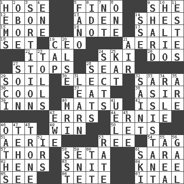 ACROSS 1. Flexible conduit 5. A pale, very dry sherry 9. A female animal or person 12. Inky black, to poets 13. Arabian gulf 14. "______ My Girl" (Turtles hit) 15. Greater amount 16. Brief written record 17. Table seasoning 18. Arrange properly for use 19. Corporate head (abbr.) 21. Nest on high 22. Slanted text style (abbr.) 24. What Jean-Claude Killy likes to do 26. Two (Sp.) 27. Closes up, plugs up 28. Dry up 29. Earth 30. Opt 32. "Two Mules for Sister ____" 36. Calm and collected 37. Consume 38. SW Saudi Arabia district 39. Restaurants 40. Taiwanese island in East China Sea 42. Small island 43. Blunders 44. Bert's buddy 46. Baseball player Mel 49. Acquire through effort 50. Allows 51. Nest on high 53. Portuguese money of account (variant) 54. Label 57. Son of Odin 58. Bristle 61. "Two Mules for Sister ____" 62. Coop moms 63. In a ____ (agitated or irritated) 64. Leg joint 65. Perceive with the eye 66. Wig 67. Slanted text style (abbr.) DOWN 1. Folds over and sews together 2. Mitch Miller's instrument 3. Determination 4. Compass dir. 5. Papal veil 6. Wedding promise 7. Fish or hair follower 8. Single 9. Broken piece 10. Sun: prefix 11. _____ Park, CO 14. Compass dir. 19. Head covering 20. Otherwise 21. Atmosphere 23. For Whom the Bell _____ 24. Religious groups 25. Krazy ___ of comics 27. Within a short period 28. Theater features 29. _-fi 31. Acquire or gain knowledge or skills 32. Inhabitant of Heaven 33. Helper 34. Cause heat under the collar 35. "We ___ not amused" (Victoria) 40. Medical imaging device (abbr.) 41. Ubangi River tributary 43. She-sheep 45. To separate or throw off 46. Curses 47. Giggle 48. Heavy duty weighing machine 52. Big collection agency 53. Assign a rank or rating to 55. Length times width 56. Highlander 58. Fast jet (abbr.) 59. Compass dir. 60. Teat (slang) 61. What Jean-Claude Killy likes to do