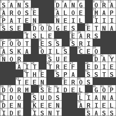 ACROSS 1. Without 5. Mild oath, euphamism for damn 9. Mouth or opening 12. Came up 14. Medicinal plant 15. Atlas unit 16. Eucharist need 17. Famous astronaut Armstrong 18. One more than two 19. Compass dir. 20. Evades 23. Inactive volcano in Sicily 24. Capri or Wright 25. Hearing organs 27. Lowest support of a structure 30. Double-curved letter 32. _ Lanka 33. "____ silly question..." 34. Lubricates 36. Corporate head (abbr.) 38. And not 39. Take to court 40. 24 hours 43. Small island 46. Not kosher 48. Singer Brickell 49. Definite Article 51. Health resort 52. Fast planes 53. Adolescent 54. Greek god of love 56. Dormintory (informal) 58. Beer mug 61. Republican Party 64. Wedding promise 65. Soap bubbles 66. Climbing, woody, usually tropical vines 68. Lair 69. Peachy ____! 70. Satellite of Uranus 71. Binary compound 72. Is not 73. Backtalk DOWN 1. Plant excrements 2. Ancient river in northeast Turkey 3. Brief written record 4. Compass dir. 5. Mild oath, euphamism for damn 6. Toward shelter 7. Annoying sounds 8. Set 9. Leaves out 10. Precipitation 11. Capital of Western Samoa 13. Extremities 21. Margarine 22. Stop 23. One of the Great Lakes 24. Call ___ day 26. Curve 27. Avid follower 28. Bear (Spanish) 29. Gumbo ingredient 31. Runs notes together 35. Oozed 37. Probability 41. Small island 42. Affirmative reply 44. A whole individual unit 45. Definite Article 47. Conductor's collection 48. Curvy letter 50. Takes place subsequently 53. Heavy duty weighing machine 55. Water jar 56. "You Light Up My Life" star Conn 57. Wrote a lyric poem 59. Locale of original sin 60. Is not 61. Greek goddess of the earth (variant) 62. Singles 63. Friends 65. What Jean-Claude Killy likes to do 67. Big collection agency