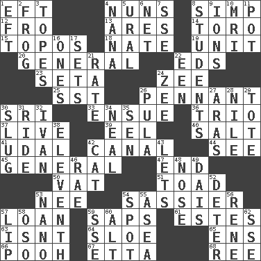 ACROSS 1. Lizard (obsolete) 4. Religious women 8. Simple or foolish person 12. From 13. Ancient Greek god of war 14. "Corrida" creature 15. Traditional theme or motif 18. Nathan's nickname 19. A single undivided whole 20. Commissioned military rank 22. Begley and Asner 23. Bristle 24. Last letter of the English alphabet 25. Fast jet (abbr.) 26. Pre-World Series prize 30. _ Lanka 33. Take place subsequently 36. Musical group of three 37. Moving, as bait 39. Snakelike fish 40. Table seasoning 41. Hereditary estate 42. Lessep's creation 44. Perceive with the eye 45. Commissioned military rank 47. Conclusion 50. Large container 51. Frog relative 53. Born 54. More lively and spirited 57. Grant temporary use of 59. Plant excrements 61. _____ Park, CO 63. Is not 64. _ gin 65. Followers of ems 66. "Silly old bear" 67. Singer James 68. To riddle DOWN 1. Bank Draft (abbr.) 2. Tree-dwelling hopper 3. Drinks excessively 4. Nanny 5. Mountain range 6. Fish or hair follower 7. Compass dir. 8. SAT takers 9. Charged particles 10. Medical imaging device (abbr.) 11. Plant holder 16. Washington bills 17. Puts into a specified state 21. Assign a rank or rating to 22. Car or cant ending 24. Last letter of the English alphabet 26. Monetary unit of Botswana 27. Ancient river in northeast Turkey 28. "Death on the ____" 29. Lug 30. Strike heavily 31. Travel on an animal 32. _ the terrible 34. Be tempered by heat 35. Elected rep. 38. Veterans Day date 42. Domesticated feline 43. Allows 46. Actress Charlotte 48. Olfactory organ 49. Raised platform 52. Prevent from occurring 53. Billionth: prefix 54. Specific locale 55. At sea 56. French philosopher Descartes 57. Mouth edge 58. Bear (Spanish) 59. Compass dir. 60. The first octave above the treble staff 62. Compass dir.
