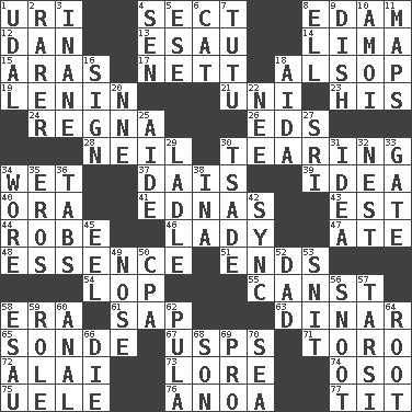 ACROSS 1. RI univ. 4. Religious group 8. Dutch treat 12. Daniel's nick name 13. He sold his birthright 14. Pale green bean 15. Caspian sea tributary 17. Remaining after all deductions 18. Columnist Joseph or Stewart 19. Soviet premier 1918-24 21. University (slang) 23. Part of HMS, perhaps 24. Canadian anthropologist Darnell 26. Begley and Asner 28. Famous astronaut Armstrong 30. Pulling apart 34. Soggy 37. Raised platform 39. It may be bright or harebrained 40. Mouth or opening 41. Ferber et al. 43. Eastern Standard Time (abbr.) 44. Loose flowing garment 46. Kenny Rogers chart-topper in '80 47. Had dinner 48. Substance 51. Conclusions 54. Chop off 55. 2nd pers. sing. pres. of can (arch.) 58. Period 61. Plant excrement 63. Middle Eastern gold or silver currency 65. Message 67. United States Postal Service (abbr.) 71. "Corrida" creature 72. Jai ____ 73. Old wives' tales, e.g. 74. Bear (Spanish) 75. Ubangi River tributary 76. Small Philippine buffalo 77. Teat (slang) DOWN 1. Allodial 2. Less widely known 3. Empty; void 4. Elected rep. 5. Compass dir. 6. Domesticated feline 7. Ballerina skirt 8. Pipe bend 9. Food container 10. Mine, in Marseilles 11. Atlas contents 16. Attach a signature 18. Opera by Verdi 20. Compass dir. 22. Born 25. Helper 27. Indian title of respect (Mr.) 29. Dipping utensil 30. Sadhe (variant) 31. It may be bright or harebrained 32. A home for chicks 33. Yard entry 34. Had on 35. Greek god of love 36. Bar bills 38. _ tizzy (2 wds.) 42. Synchronize (abbr.) 45. Snakelike fish 49. Sense of smell 50. Tax preparer (abbr.) 52. Male parent 53. In a ____ (agitated or irritated) 56. Snob 57. Tarsus (plural) 58. Son of Isaac 59. Hero or heavy, e.g. 60. Of or related to the anus 62. Monetary unit of Botswana 64. Carrot, for example 66. Pass on 68. Manchild 69. Adept person 70. Ocean