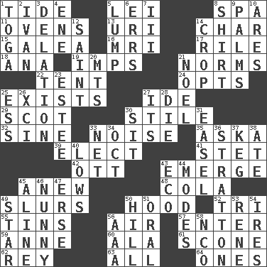ACROSS 1. Event that recurs at intervals 5. Luau accessory 8. Health resort 11. Baking chambers 13. RI univ. 14. Burn to charcoal 15. An organ shaped like a helmet 16. Medical imaging device (abbr.) 17. Cause heat under the collar 18. Santa ___, CA 19. Naughty children 21. Typical standards 22. Portable shelter 24. Elects 25. Has an existence 27. Binary compound 29. Native of Scotland 30. Vertical member of a panel or frame 32. Trig term 33. Annoying sound 35. "____ silly question..." 39. Voters do this 41. Proofreading order 42. Baseball player Mel 43. Develop 45. Afresh 48. Root beer relative 49. Runs notes together 50. Parka part 52. Three (prefix) 55. Metal containers 56. Wind 57. Keyboard key 59. Singer Murray 60. Insect wing 61. Biscuitlike quick bread 62. Marina Del _, California 63. 100% 64. Washington bills DOWN 1. Ancient Roman robe 2. "Terrible" tsar 3. Conveyance 4. Compass dir. 5. Mass 6. Blunders 7. One more than two 8. Upper-body garment 9. Insides of hands 10. Ancient Greek god of war 12. Virtuous person 14. Riding implement 20. Mountains (abbr.) 21. Christmas carol 23. First name in cosmetics 25. Double-curved letter 26. One more than ninety 27. It is 28. Expire 30. Be seated 31. Artist's stand 33. Fish or hair follower 34. Sep. follower 36. Ski resort town in Vermont 37. Barrel 38. Had dinner 40. Coldest temperatures 43. Environmental prefix 44. Methods 45. Place in a line 46. Pet term 47. Celtic language 49. Play the lead 50. Land elevation 51. Taken by mouth 53. French philosopher Descartes 54. Angers 56. Auto club (abbr.) 58. Non-commissioned officer (abbr.)
