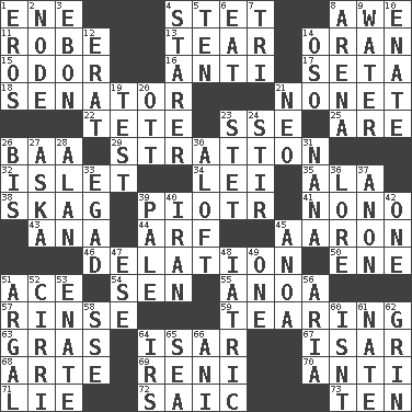 ACROSS 1. Compass dir. 4. Proofreading order 8. Deep reverence 11. Loose flowing garment 13. Pull apart 14. Northwest Algerian city 15. Scent 16. Opposed to 17. Stalk of a moss capsule 18. Elected representative 21. Music written for nine 22. Wig 23. Compass dir. 25. "We ___ not amused" (Victoria) 26. Sound made by sheep 29. Ski resort town in Vermont 32. Small island 34. Luau accessory 35. According to 38. Heroin 39. Peter (Polish) 41. Words to Nanette 43. Santa ___, CA 44. Sandy's bark 45. Composer Copland 46. Accusation by an informer 50. Compass dir. 51. Adept person 54. Elected rep. 55. Small Philippine buffalo 57. Wash lightly 59. Rending 63. Pate de foie ____ 64. Astrian river, tributary to the Danube 67. Astrian river, tributary to the Danube 68. Johnson of "Laugh-In" 69. Painter Guido (1575-1642) 70. Against 71. Whopper 72. Ketch in the Levant 73. Nine, plus one DOWN 1. Greek god of love 2. Connecting point 3. Inky black, to poets 4. A viewer who gazes fixedly 5. Nine, plus one 6. Erode 7. Three (prefix) 8. Sports stadium 9. Wetness 10. Related on the mother's side 12. Part of Q.E.F. 14. Bear (Spanish) 19. Trial 20. Baseball player Mel 21. Modern: prefix 23. Proofreading order 24. Commotion 26. Again 27. "____ silly question..." 28. Actor Alda or Thicke 30. High up in or into the air 31. Nanny 33. Mild oath 36. Old wives' tales, e.g. 37. At once, immediately (arch.) 39. Diluted with white 40. SW Asia republic 42. Single 45. Small Philippine buffalo 47. Compass dir. 48. Of or pertaining to medicine 49. Single 51. Therefore, facetiously 52. High-altitude cloud 53. Maternal 56. Roberta Peters solo 58. Compass dir. 60. Is not 61. Nathan's nickname 62. Amused look 64. Big collection agency 65. Ocean 66. Cuckoo