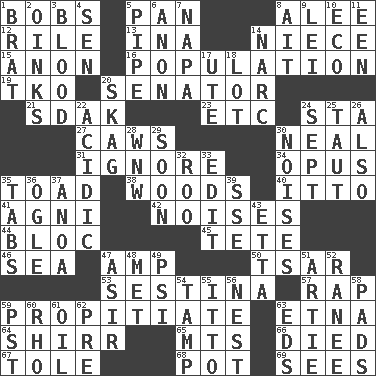 ACROSS 1. Moves up and down 5. Baking dish 8. Toward shelter 12. Cause heat under the collar 13. _ tizzy (2 wds.) 14. Sibling's daughter 15. Soon (poet.) 16. Census information 19. Ring climax 20. Elected representative 21. Neighbor of Neb. 23. And so on (abbr.) 24. R.R. building 27. Crow sounds 30. Be tempered by heat 31. Refuse to acknowledge 34. Musical composition 35. Frog relative 38. Forest 40. "Tell ____ the Marines!" 41. Hindu god of fire 42. Annoying sounds 44. Coalition 45. Wig 46. Ocean 47. Electrical Unit 50. Russian ruler of old 53. French poetic form 57. Hit sharply and swiftly 59. Conciliate 63. Inactive volcano in Sicily 64. Bake eggs in their shells 65. Mountains (abbr.) 66. Passed on 67. Lacquered or enameled metalware 68. Cooking vessel 69. Perceives with the eye DOWN 1. Naughty child 2. Pig sounds 3. Vital fluid 4. Elected rep. 5. Corncob 6. At once, immediately (arch.) 7. California wine valley 8. Small island 9. Flowery wreath 10. Environmental prefix 11. Car or cant ending 14. Drug cop 17. Shoshoni 18. Car dealer's back yard 20. Heroin 22. Being or containing an acid 24. Back-to-school mo. 25. Strained 26. In addition 28. Compass dir. 29. Within a short period 30. Annoying sounds 32. Friend of Pooh 33. Prepare for publication 35. Bar bills 36. Stare at amorously 37. Small Philippine buffalo 39. Compass dir. 43. Singer James 47. SW Saudi Arabia district 48. Was introduced to 49. 23rd letter of the Greek alphabet 51. Nick name for Arthur 52. The wife of a rajah (variant) 54. Pack (down) 55. "Tell ____ the Marines!" 56. Egg locale 58. Writing tablets 59. Pacific Standard Time (abbr.) 60. 17th letter of the Greek alphabet 61. Petroleum 62. Before (prefix) 63. Begley and Asner