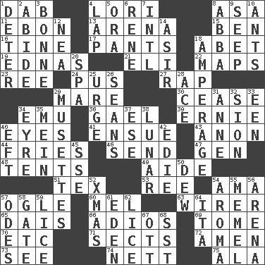 ACROSS 1. Apply (a substance) by light strokes 4. Australian parrot (variant) 8. White ___ sheet 11. Inky black, to poets 13. Sports stadium 15. Benjamin's nick name 16. Prong on a fork 17. Leg coverings 18. Collude with 19. Ferber et al. 21. Connecticut Ivy Leaguer 22. Atlas contents 23. To separate or throw off 24. Tenth month of the Hindu calendar 27. Reproach for some lapse or misdeed 29. Female horse 30. Desist 34. Australian flightless bird 36. Highlander 39. Bert's buddy 40. Snake ____ (dice throw) 41. Take place subsequently 43. At once, immediately (arch.) 44. Strips of potato fried in deep fat 46. Transmit 47. Commissioned military rank (abbr.) 48. Portable shelters 49. Assistant 51. John Ritter's dad 53. Portuguese money of account (variant) 54. Nursemaid (var.) 57. Stare at amorously 60. Cartoonist voice _ Blanc 63. One who wires 65. Raised platform 66. Goodbye (Sp.) 69. Heavy book 70. And so on (abbr.) 71. Religious groups 72. So be it 73. Observe 74. Remaining after all deductions 75. Wing DOWN 1. Prevent from occurring 2. Remain 3. Child's nurse 4. Pet locale 5. Mouth or opening 6. French philosopher Descartes 7. International (abbr.) 8. Swedish rock group 9. Ooze 10. Pismires 12. Teachers' org. 14. SW Saudi Arabia district 18. Electrical Measurement 20. Health resort 25. Goad 26. Actors Connery and Penn 28. Adept person 29. French bagpipes 31. Queen of England 1702-14 32. The Jewish people; Israel 33. Car or cant ending 34. Jane of fiction 35. Count _ (2 wds.) 37. Compass dir. 38. Type of eclipse 40. Newt 42. Singer Brickell 45. Compass dir. 50. Morning condensation 52. Dec. holiday 54. Scent 55. Klaipeda city 56. Sports stadium 57. Lyric poems 58. Yard entry 59. Louse (plural) 61. Paradise 62. Louse (plural) 64. Call ___ day 67. Baseball player Mel 68. Fast jet (abbr.)