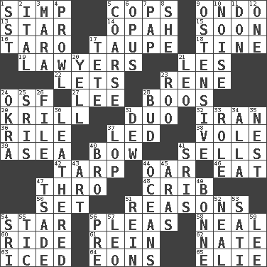 ACROSS 1. Simple or foolish person 5. 911 reaches them 9. Southwest Nigerian state 13. Play the lead 14. Brightly colored fish 15. Within a short period 16. Edible starchy tuberous root 17. Grayish beige 18. Prong on a fork 19. Those who practice law 21. French article 22. Allows 23. French philosopher Descartes 24. Order of Saint Francis (abbr.) 27. Area sheltered from the wind 28. Expressions of contempt or scorn 29. Shrimp-like planktonic crustaceans 31. Superhero pair 32. SW Asia republic 36. Cause heat under the collar 37. Directed 38. Short-tailed, large-bodied rat 39. At sea 40. Ribbon knot 41. Makes a sale 42. Canvas cover 44. Rowing implement 46. Ingest 47. Through, poetically 48. Baby bed with high sides 50. Arrange properly for use 51. Thinks logically 54. Play the lead 56. Entreaties 58. Anneal 60. Travel on or in a vehicle 61. It's straight from the horse's mouth 62. Nathan's nickname 63. On the rocks 64. Immeasurably long periods of time 65. Writer Wiesel DOWN 1. Fast jet (abbr.) 2. Slanted text style (abbr.) 3. Hindu Mythology: god of death 4. Move like a hungry wolf 5. Rough 6. Musical composition 7. Infant food 8. A female animal or person 9. Clearly or manifestly demonstrative 10. Annoying sound 11. Spanish title 12. Single 17. False hair 20. Shout 21. Lion 23. Friend of Pooh 24. Gumbo ingredient 25. Indian titles of respect 26. Do some clerical work 28. Partially opened flower 30. Tough but pliablecoriaceous 31. Morning condensation 33. Hero or heavy, e.g. 34. Silent film actress Nazimova 35. A home for chicks 37. Chop off 40. Sis' sibling 41. Indian titles of respect 43. Nonscientific branch of learning 44. Seas 45. Ancient river in northeast Turkey 47. Sadhe (variant) 49. Child's nurse 51. It's straight from the horse's mouth 52. Anneal 53. Suttee (variant) 54. Indian title of respect (Mr.) 55. Nervous spasm 56. Before (prefix) 57. Lion 59. Area sheltered from the wind