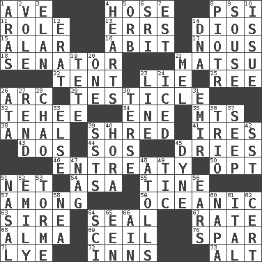 ACROSS 1. "___ Maria" 4. Stockings 8. 23rd letter of the Greek alphabet 11. Hero or heavy, e.g. 13. Blunders 14. "Vaya con ____" 15. Having or resembling wings 16. "This won't hurt ____!" 17. Common sense 18. Legislator 21. Taiwanese island in East China Sea 22. Portable shelter 23. Whopper 25. To separate or throw off 26. Curve 29. A testis 32. Giggle 34. Compass dir. 35. Mountains (abbr.) 38. Of or related to the anus 39. Tear up 41. Angers 43. Two (Sp.) 44. Distress signal 45. Frees from moisture 46. Plea 50. Choose 51. Fish or hair follower 54. White ___ sheet 55. Prong on a fork 57. Amid 59. Pertaining to the sea 63. The founder of a family 64. Lick closed 67. Pace 68. _ mater 69. To provide with a ceiling 70. Practice fight 71. Potassium hydroxide 72. Restaurants 73. The first octave above the treble staff DOWN 1. Caspian sea tributary 2. Short-tailed, large-bodied rat 3. Style 4. Centers of feelings and intuitions 5. Globe 6. Indian title of respect (Mr.) 7. Eastern Standard Time (abbr.) 8. Peter (Polish) 9. Lush 10. Come out of 12. Part of Q.E.F. 14. Heredity factor (abbr.) 19. False hair 20. Single 21. Cartoonist voice _ Blanc 23. Actor's bit 24. On the rocks 26. _ moment's notice (2 wds.) 27. Tear apart 28. US Secretary of Labor Elaine L. _ 30. Laconic 31. Arab leader 33. Otherwise 36. Musical group of three 37. Ooze 39. Fast planes 40. Israeli folk dance 42. Fast jet (abbr.) 45. Unit of force 47. Tired old horse 48. Ringlike coral islands and reefs 49. Nervous spasm 51. Relating to the nose 52. Poet Dickinson 53. Singer Mel 56. Hearing organs 58. Teachers' org. 60. California wine valley 61. Slanted text style (abbr.) 62. Foregone conclusion 64. _-fi 65. Car or cant ending 66. The 18th letter of the Arabic alphabet