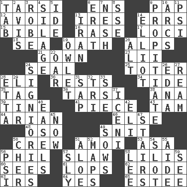 ACROSS 1. Tarsus (plural) 6. Followers of ems 9. Infant food 12. Shun 13. Angers 14. Blunders 15. God's Word 16. Raze (variant) 17. Event scenes 18. Ocean 19. Pledge 20. High mountains 21. Long dress 23. Cards in a Roman deck? 24. Lick closed 25. Carrier 28. Biblical high priest 30. Musical pauses 34. Periodic rise and fall of the sea level 35. Label 36. Tarsus (plural) 38. Santa ___, CA 39. Prong on a fork 41. Part 43. Scottish cap 44. Believer in; advocate of (suffix) 46. Otherwise 48. Bear (Spanish) 49. In a ____ (agitated or irritated) 50. Ship's personnel 51. Mine, in Marseilles 53. White ___ sheet 56. Silvers or Donahue 57. Cole _ (cabbage dish) 58. Ms. Damita and namesakes 60. Perceives with the eye 61. Chops off 62. Eat (away) 63. Big collection agency 64. It is so 65. First name in cosmetics DOWN 1. Keyboard key 2. Opinion 3. Loose flowing garment 4. Fodder prepared in a silo 5. Binary compound 6. Part of Q.E.F. 7. Delicate 8. Compass dir. 9. Appease 10. Arches 11. Air pressure measure (abbr.) 13. SW Asia republic 14. American author Paul (1891-1958) 19. A small or young owl 20. The first octave above the treble staff 22. Rowing implement 24. Seigniories (variant) 26. Pulitzer Prize-winning author Ferber 27. 480, 500 or 516 sheets of paper 28. Singer James 29. Den 31. Plant excrement 32. Three (prefix) 33. Compass dir. 37. Ancient Celtic tribe of eastern Britain 40. Artist's stands 42. Biblical high priest 45. Immediately 47. Flight of steps 49. Sty mamas 50. "Mermaids" star 51. _ vera 52. Atlas contents 54. Slit 55. Helper 56. Air pressure measure (abbr.) 57. Playfully artful 58. Area sheltered from the wind 59. Perceive with the eye