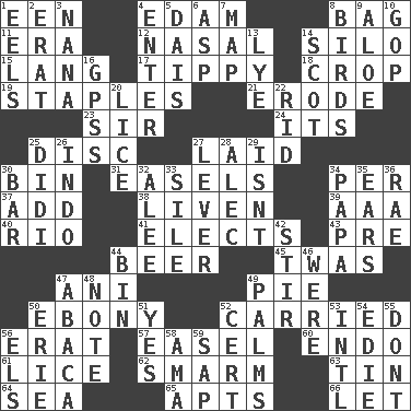 ACROSS 1. Car or cant ending 4. Dutch treat 8. Paper or plastic container 11. Period 12. Relating to the nose 14. Grain storage tower 15. Austrian-born American filmmaker Fritz 17. Likely to tip or tilt 18. Riding implement 19. Paper fasteners 21. Wear away 23. Title for a knight 24. ___ a Wonderful Life 25. Compact _ 27. Put down 30. Storage container 31. Artist's stands 34. For each 37. Increase 38. Make or become more lively 39. Auto club (abbr.) 40. _ de Janeiro 41. Opts 43. Before (prefix) 44. Fermented drink made from hops 45. It was, poetically 47. Black tropical American cuckoo 49. Sliced dessert 50. Black 52. Borne 56. Part of Q.E.F. 57. Artist's stand 60. Inside; within (prefix) 61. Louse (plural) 62. Excessive but superficial compliments 63. Shallow baking pan 64. Ocean 65. Flats, for short 66. Allow DOWN 1. Snakelike fish 2. Part of Q.E.F. 3. Grandmother 4. Keyboard key 5. Raised platform 6. Viper 7. Atlas unit 8. Avian creatures 9. Medicinal plant 10. Grand Old Party 13. Sodium hydroxide 14. Native of Scotland 16. Global Positioning Systems (abbr.) 20. Louse (plural) 22. To free from 25. "You Light Up My Life" star Conn 26. Southeast Asian peninsula 27. Crowbar 28. Actor Baldwin 29. Is not 30. Soap unit 32. Toward shelter 33. Drop; flow; fall 34. Dad 35. Hearing organs 36. Actress Charlotte 42. Disorderly outburst 44. Storage container 46. We are 47. Phillipine bananalike plant 48. Musical sound 49. Insides of hands 50. One of the Great Lakes 51. Affirmative reply 52. Certainty 53. International (abbr.) 54. Singer Brickell 55. Do not 56. Raised railways 58. Nanny (var.) 59. Plant excrement