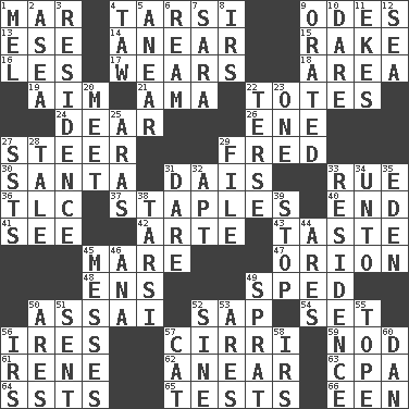 ACROSS 1. Make imperfect 4. Tarsus (plural) 9. Lyric poems 13. Compass dir. 14. Approach 15. Immoral or dissolute person 16. French article 17. Puts on (as clothing) 18. Length times width 19. Direct toward a target or goal 21. Housemaid (var.) 22. Hauls 24. Letter starter 26. Compass dir. 27. Bull 29. Flintstone 30. Before Barbara or Clara 31. Raised platform 33. Regret 36. Affectionate concern, for short 37. Paper fasteners 40. Conclude 41. Observe 42. Johnson of "Laugh-In" 43. Clothes sense 45. Female horse 47. Greek mythologigal hunter 48. Followers of ems 49. Hurried 50. Slender Brazilian palm 52. Plant excrement 54. Arrange properly for use 56. Angers 57. High-altitude cloud 59. Allow head to fall sleepily 61. French philosopher Descartes 62. Approach 63. Numbers guy (abbr.) 64. Fast planes 65. Trials 66. Car or cant ending DOWN 1. Cartoonist voice _ Blanc 2. At sea 3. Home 4. The 23rd letter of the Hebrew alphabet 5. Approach 6. 480, 500 or 516 sheets of paper 7. "Two Mules for Sister ____" 8. Big collection agency 9. Spoke pompously 10. Have the gumption 11. Supplements with great effort 12. Ocean 20. Confront 22. Laconic 23. Single 25. Ancient river in northeast Turkey 27. Fast planes 28. Falsehood 29. Do some clerical work 31. Have the gumption 32. Fitting 33. Dwelling 34. To (old English) 35. Locale of original sin 38. Tarsus (plural) 39. Close up, plug up 44. Ancient Greek god of war 45. Makes clutter 46. Santa ___, CA 49. Small fatty European fish 50. Ancient Greek god of war 51. Posted 52. Trig term 53. Ancient Greek god of war 55. Drink excessively 56. Big collection agency 57. Feline 58. Big collection agency 60. One of the 12 tribes of Israel