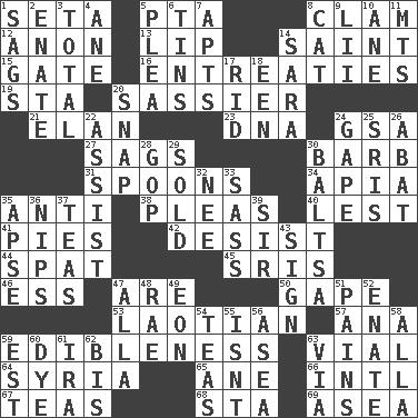 ACROSS 1. Bristle 5. Parent Teacher Association (abbr.) 8. Burrowing marine mollusk 12. Soon (poet.) 13. Mouth edge 14. Inhabitant of Heaven 15. Yard entry 16. Pleas 19. R.R. building 20. More impudent 21. Liveliness 23. Heredity factor (abbr.) 24. Girls' org. (abbr.) 27. Settles 30. Sharp remark 31. Soup utensils 34. Capital of Western Samoa 35. Against 38. Entreaties 40. For fear that 41. Sliced desserts 42. Stop 44. Petty quarrel 45. Indian titles of respect 46. Double-curved letter 47. "We ___ not amused" (Victoria) 50. Open wide 53. Of or relating to Laos or its people 57. Santa ___, CA 59. The property of being fit to eat 63. Small bottle 64. Damascus' land 65. One (Scot) 66. International (abbr.) 67. Afternoon social gatherings 68. R.R. building 69. Toward the sea DOWN 1. Sinks 2. Related on the mother's side 3. Add up to 4. A saturated hydrocarbon 5. Entreaty 6. Airtight sealed metal containers 7. Tenement units (abbr.) 8. Domesticated feline 9. Cards in a Roman deck? 10. One (Scot) 11. Mountains (abbr.) 14. "Two Mules for Sister ____" 17. To free from 18. Car or cant ending 20. Fastener 22. Help 24. Open wide 25. Indian titles of respect 26. Blind as ____ 28. Republican Party 29. Disposed of to a purchaser 30. Greek mezzo-soprano Agnes 32. Born 33. Backtalk 35. Domed church section 36. Pinches, bites 37. Beverages made from leaves 39. Title for a knight 43. Attach a signature 47. Silent film actress Nazimova 48. Actress Charlotte 49. Age 51. Aches 52. Related on the mother's side 54. Afternoon social gatherings 55. Is not 56. At sea 58. Silent film actress Nazimova 59. Eastern Standard Time (abbr.) 60. Color 61. Lyricist Gershwin 62. Altar cloth linen 63. By way of