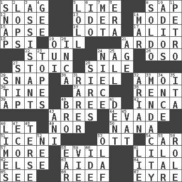 ACROSS 1. Volcanic refuse 5. Welles in "The Third Man" 9. Plant excrement 12. Olfactory organ 13. Baltic tributary 14. Method 15. Domed church section 16. Globular water bottle used in Asia 17. Set down 18. Air pressure measure (abbr.) 19. Lubricate 21. Zeal 22. Surprise greatly 24. Tired old horse 26. Bear (Spanish) 27. Unemotional 28. Drop; flow; fall 29. Fastener 30. Satellite of Uranus 32. Mine, in Marseilles 36. Prong on a fork 37. Curve 38. Monthly bill 39. Tenement units (abbr.) 40. A special lineage 42. South American Indian 43. Ancient Greek god of war 44. Elude 46. Allow 49. And not 50. Nanny 51. Ancient Celtic tribe of eastern Britain 53. Baseball player Mel 54. Auto 57. Greater amount 58. Morally bad or wrong 61. _ and Stitch 62. Otherwise 63. Opera by Verdi 64. Slanted text style (abbr.) 65. Perceive with the eye 66. Coral collection 67. Jane of fiction DOWN 1. Fastener 2. Chops off 3. Helper 4. Unit of force equal to gravity 5. Hang loosely or laxly 6. Wedding promise 7. Was introduced to 8. Epoch 9. Twentieth part of a lira 10. Goodbye (Sp.) 11. Stone: prefix 14. Make imperfect 19. Fr. "Yes" 20. South American Indian 21. Ripen 23. Drinks excessively 24. Sibling's daughter 25. Everything 27. Clip 28. Male parents of animals 29. R.R. building 31. More uncommon 32. Believer in; advocate of (suffix) 33. Ananias' fault 34. Single time 35. Call ___ day 40. Sis' sibling 41. Gouge 43. Cuckoo 45. Large container 46. Citrus fruits 47. Learning spot: Fr. 48. Laconic 52. Born 53. Norwegian king 55. Having or resembling wings 56. Hero or heavy, e.g. 58. Ewer handle 59. Compete 60. Binary compound 61. Untruth