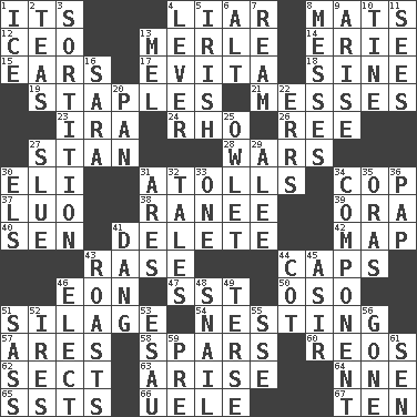 ACROSS 1. It is 4. One who doesn't tell the truth 8. Floor coverings 12. Corporate head (abbr.) 13. Haggard of country music 14. One of the Great Lakes 15. Hearing organs 17. Webber/Rice musical 18. Trig term 19. Paper fasteners 21. Makes clutter 23. Lyricist Gershwin 24. 17th letter of the Greek alphabet 26. To riddle 27. Comedian Laurel of Laurel & Hardy 28. Armed conflicts 30. Connecticut Ivy Leaguer 31. Ringlike coral islands and reefs 34. Police officer (slang) 37. Nilotic language 38. The wife of a rajah (variant) 39. Mouth or opening 40. Elected rep. 41. Erase 42. Atlas unit 43. Raze (variant) 44. Smile enhancers 46. Period of immesurable duration 47. Fast jet (abbr.) 50. Bear (Spanish) 51. Fodder prepared in a silo 54. Nestling 57. Ancient Greek god of war 58. Practice fights 60. Vintage cars 62. Religious group 63. Get up 64. Compass dir. 65. Fast planes 66. Ubangi River tributary 67. "___ Little Indians" DOWN 1. Frozen water 2. Afternoon social gatherings 3. Making a chance decision by using lots 4. Crowbar 5. From or relating to Ireland 6. Keyboard modifier key 7. 480, 500 or 516 sheets of paper 8. Makes clutter 9. Get up 10. Prong on a fork 11. Perceives with the eye 13. Cartoonist voice _ Blanc 16. "Two Mules for Sister ____" 20. Baking dish 22. Blunders 25. A small or young owl 27. Turn sharply 29. Toward shelter 30. Raised railways 31. Ancient Greek god of war 32. Lies 33. Single 34. Piece 35. Mouths or openings 36. Infant food 41. Mild oath, euphamism for damn 43. Cooks with dry heat, as in an oven 44. Small bed 45. SW Saudi Arabia district 46. Choose 48. Slow-paced one 49. Laconic 51. Backtalk 52. Angers 53. He sold his birthright 55. Compass dir. 56. Went 59. Before (prefix) 61. Elected rep.
