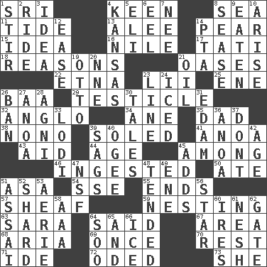 ACROSS 1. Indian title of respect (Mr.) 4. Peachy ____! 8. Ocean 11. Event that recurs at intervals 13. Toward shelter 14. Lightbulb-shaped fruit 15. The content of cognition 16. Mediterranean tributary 17. Jacques of French films 18. Thinks logically 21. Fertile tracts in a desert 22. Inactive volcano in Sicily 23. Cards in a Roman deck? 25. Compass dir. 26. Sound made by sheep 29. A testis 32. White American of non-Hispanic descent 34. One (Scot) 35. Male parent 38. Words to Nanette 39. Having a sole or soles 41. Small Philippine buffalo 43. Assist 44. Ripen 45. Amid 46. Consumed 50. Had dinner 51. White ___ sheet 54. Compass dir. 55. Conclusions 57. Archer's quiver 59. Inhabiting a nest 63. "Two Mules for Sister ____" 64. Alleged 67. Length times width 68. Roberta Peters solo 69. Single time 70. Relief 71. Binary compound 72. Wrote a lyric poem 73. A female animal or person DOWN 1. Tumult 2. Travel on or in a vehicle 3. It may be bright or harebrained 4. Sunflower state 5. Biblical high priest 6. Snakelike fish 7. Born 8. Gospel singer Marvin 9. Ingested 10. Get up 12. Comfort 14. Parent Teacher Assoc. 19. "Beetle Bailey" pooch 20. Compass dir. 21. Petroleum 23. Actor's bit 24. On the rocks 26. Forbid 27. Small Philippine buffalo 28. Hindu god of fire 30. Falsehoods 31. Dutch treat 33. Farming town in central California 36. Small Philippine buffalo 37. Do not 39. Settles 40. Double curve, resembling the letter S 42. Personal question 45. Does sums 47. Science/research agcy. 48. Watched over 49. Compass dir. 51. Slender Brazilian palm 52. Pottery fragment 53. Nest on high 56. Play the lead 58. Auto club (abbr.) 60. Angers 61. Tender 62. Yard entry 64. "Barney Miller" actor Jack 65. Added to 66. Frozen water